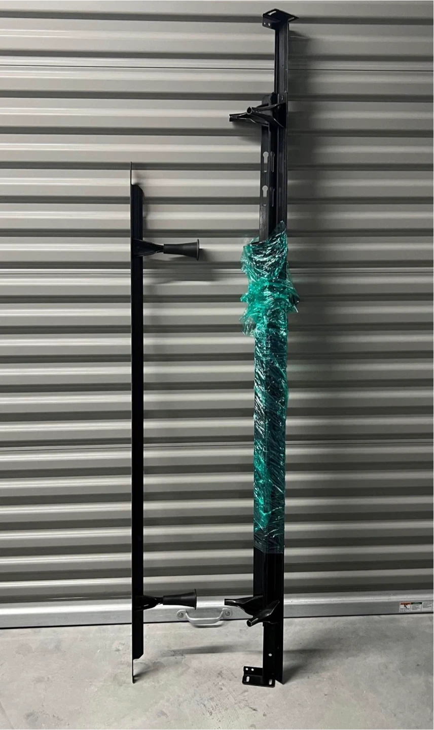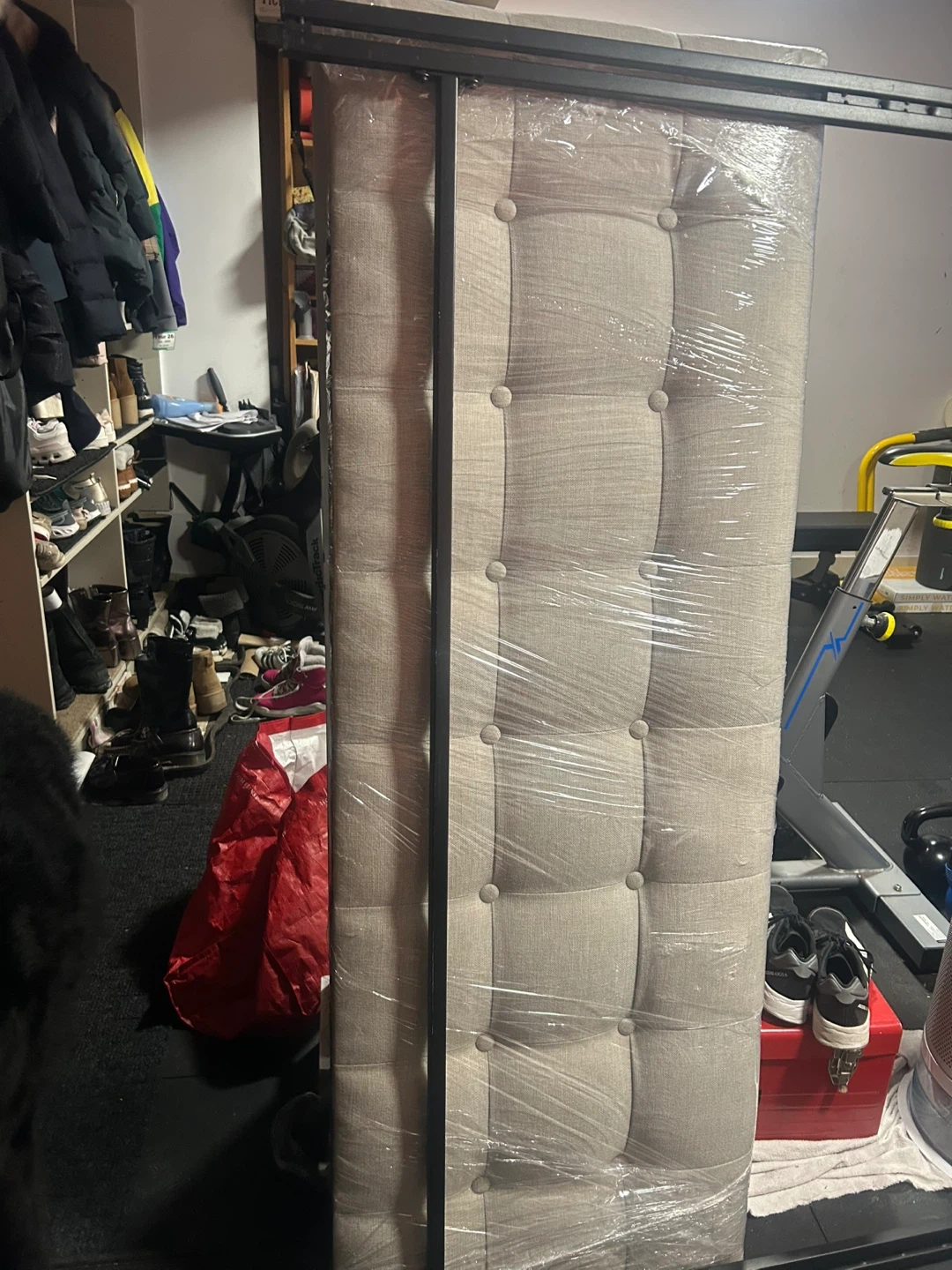 light beige tufted headboard. Includes two metal support poles. Headboard is upholstered and button-tufted. Used only for staging