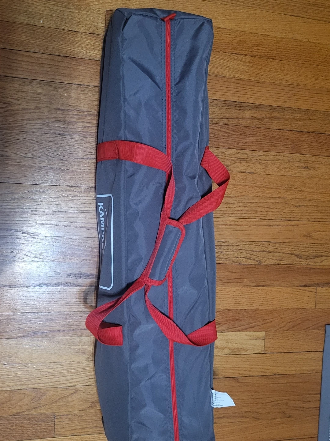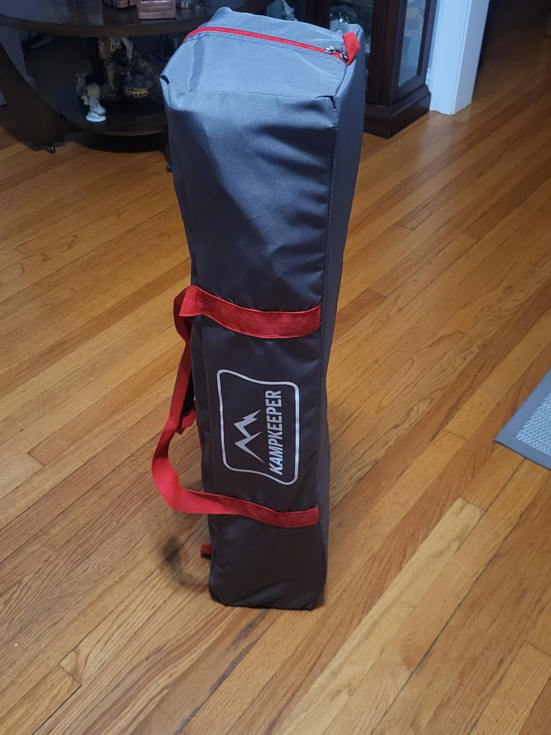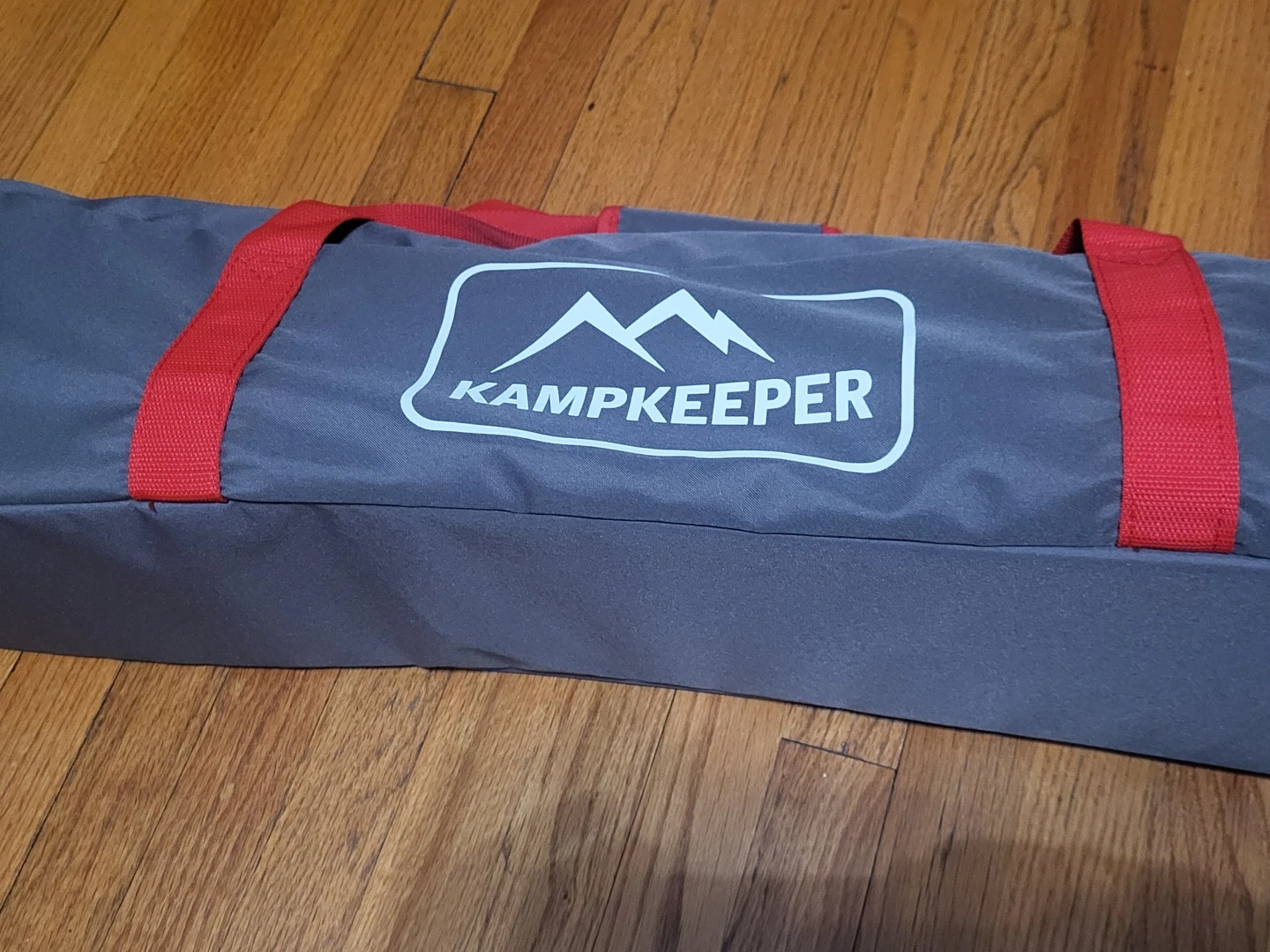 This is a portable camping cot made by KampKeeper. It's constructed from durable polyester and includes a carrying bag for easy transport. The cot's frame is sturdy metal.
