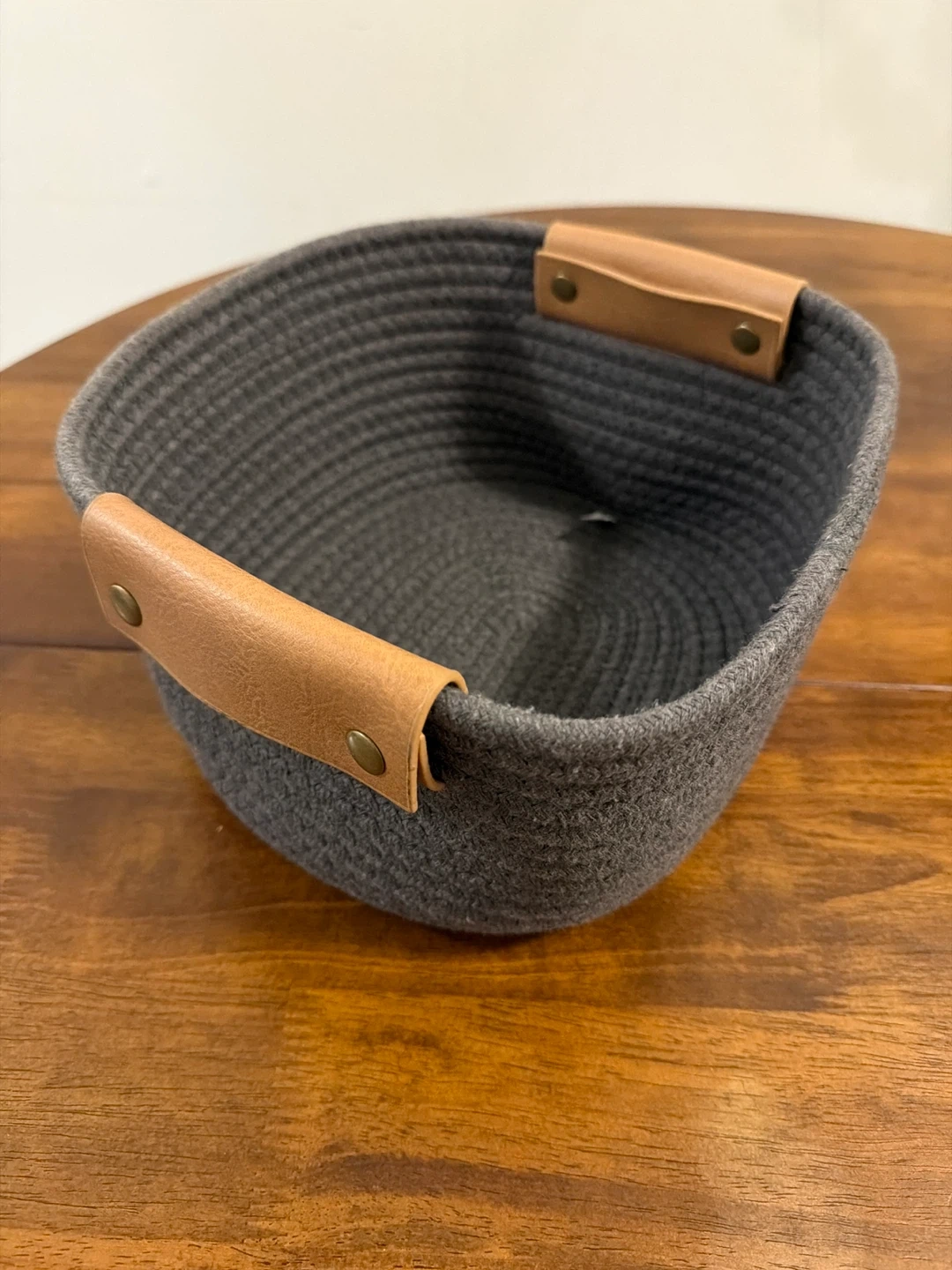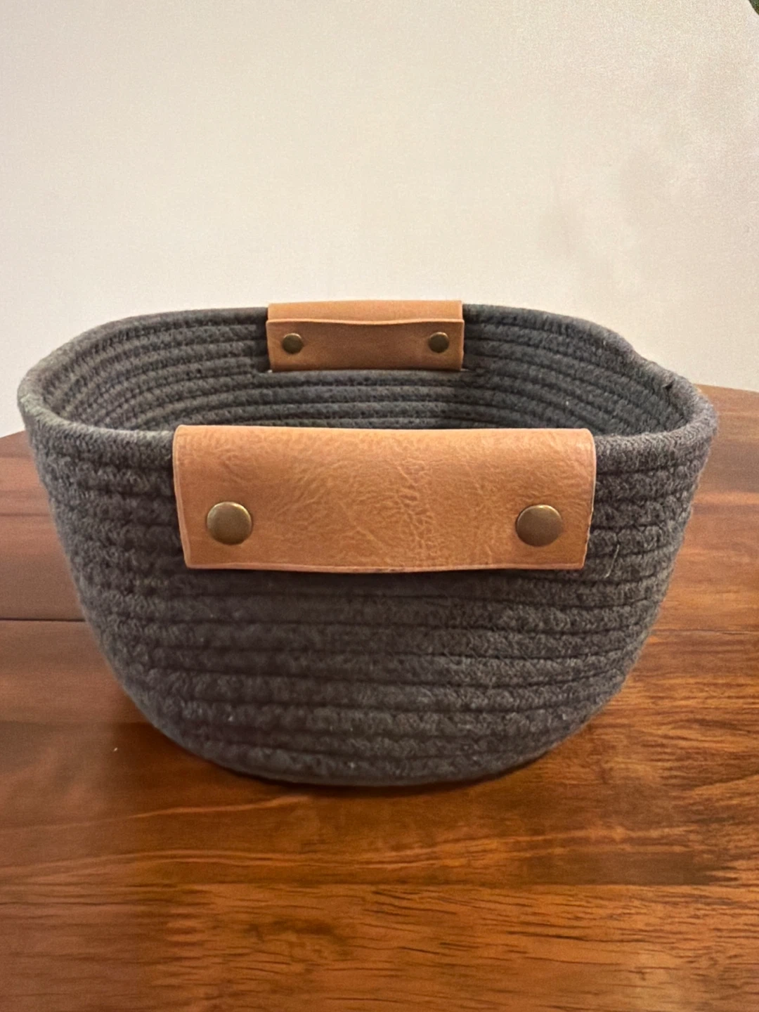 This is a gray woven rope storage basket. It has two faux leather handles secured with brass-toned rivets. Its compact size makes it handy for organizing small items on shelves or tables. Use it to store keys, mail, or toiletries!