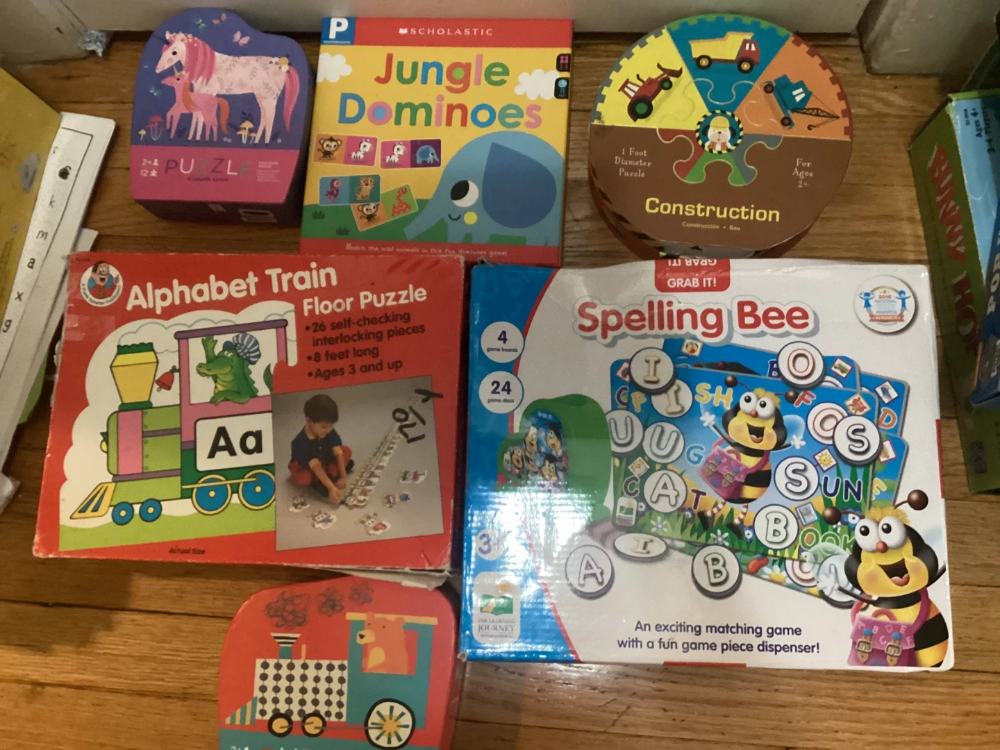 This lot includes a Scholastic Jungle Dominoes game and an Alphabet Train floor puzzle. The Alphabet Train puzzle has 26 self-checking interlocking pieces and is 8 feet long. It's recommended for ages 3 and up. Also included is a 1-foot diameter Construction puzzle for ages 2+ and a Spelling Bee matching game.