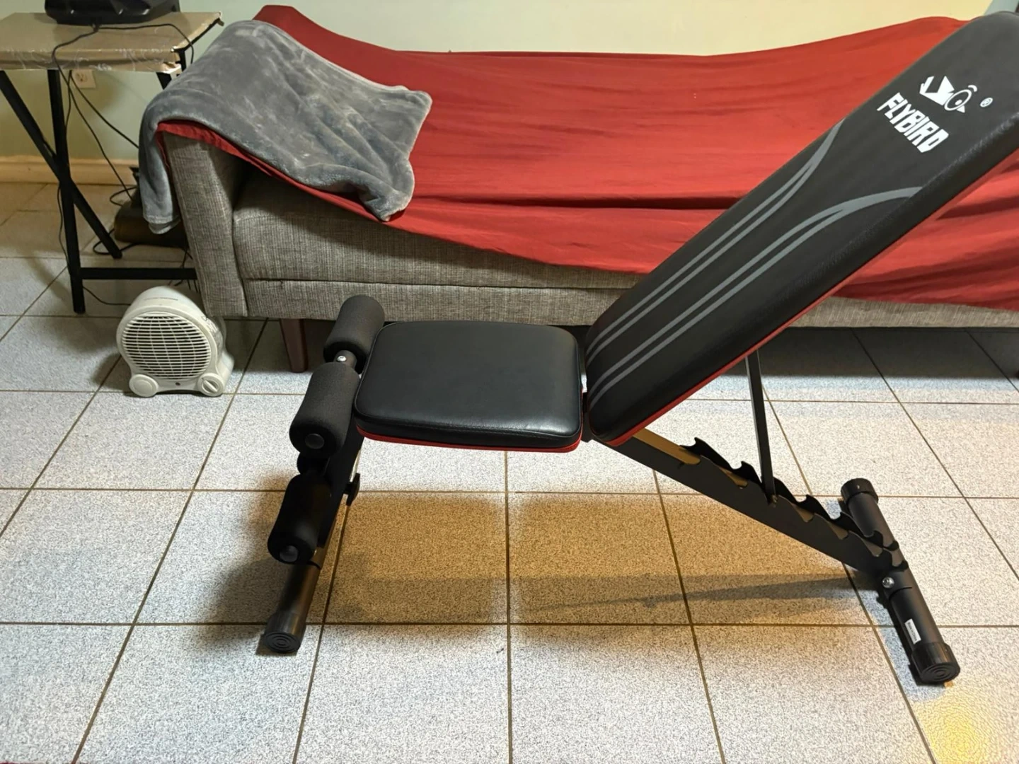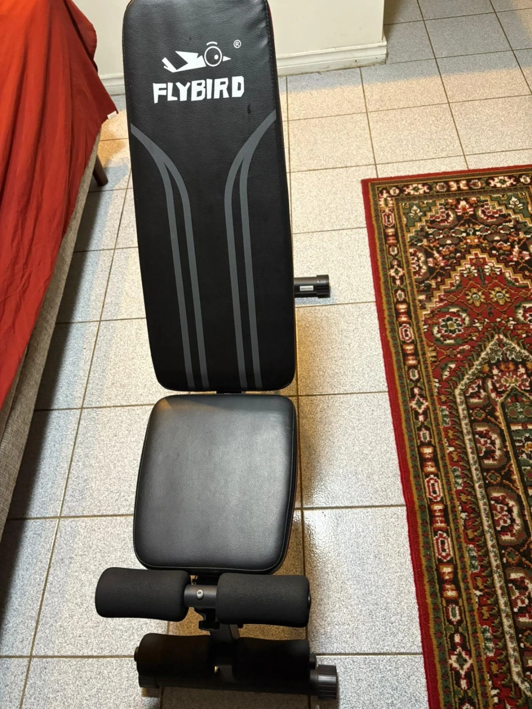 This FLYBIRD weight bench is great for your home gym workouts. It's upholstered in black faux leather with grey accents. It features padded leg rollers for comfort.