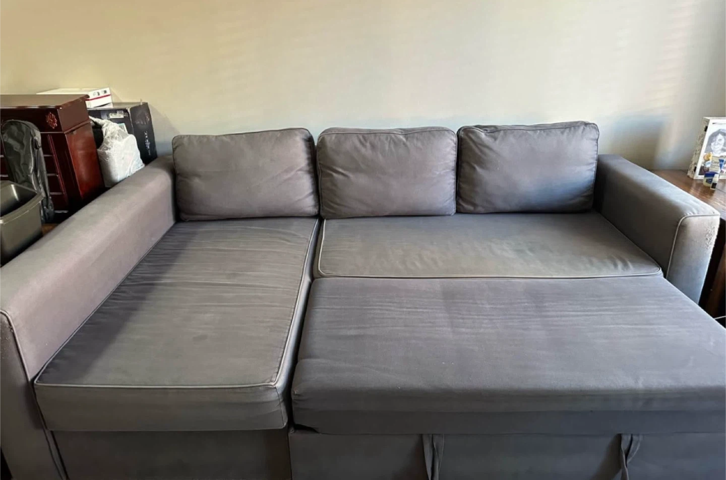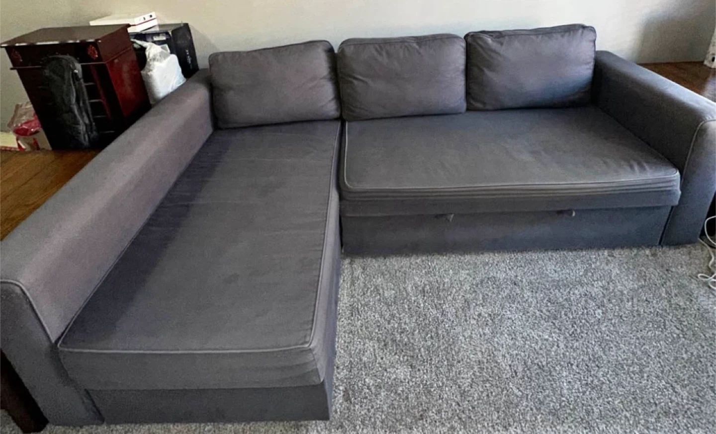 Gray sectional sofa that easily converts into a bed. It features hidden storage under the chaise. The upholstery is a durable fabric. Perfect for small spaces needing extra seating and sleeping options!