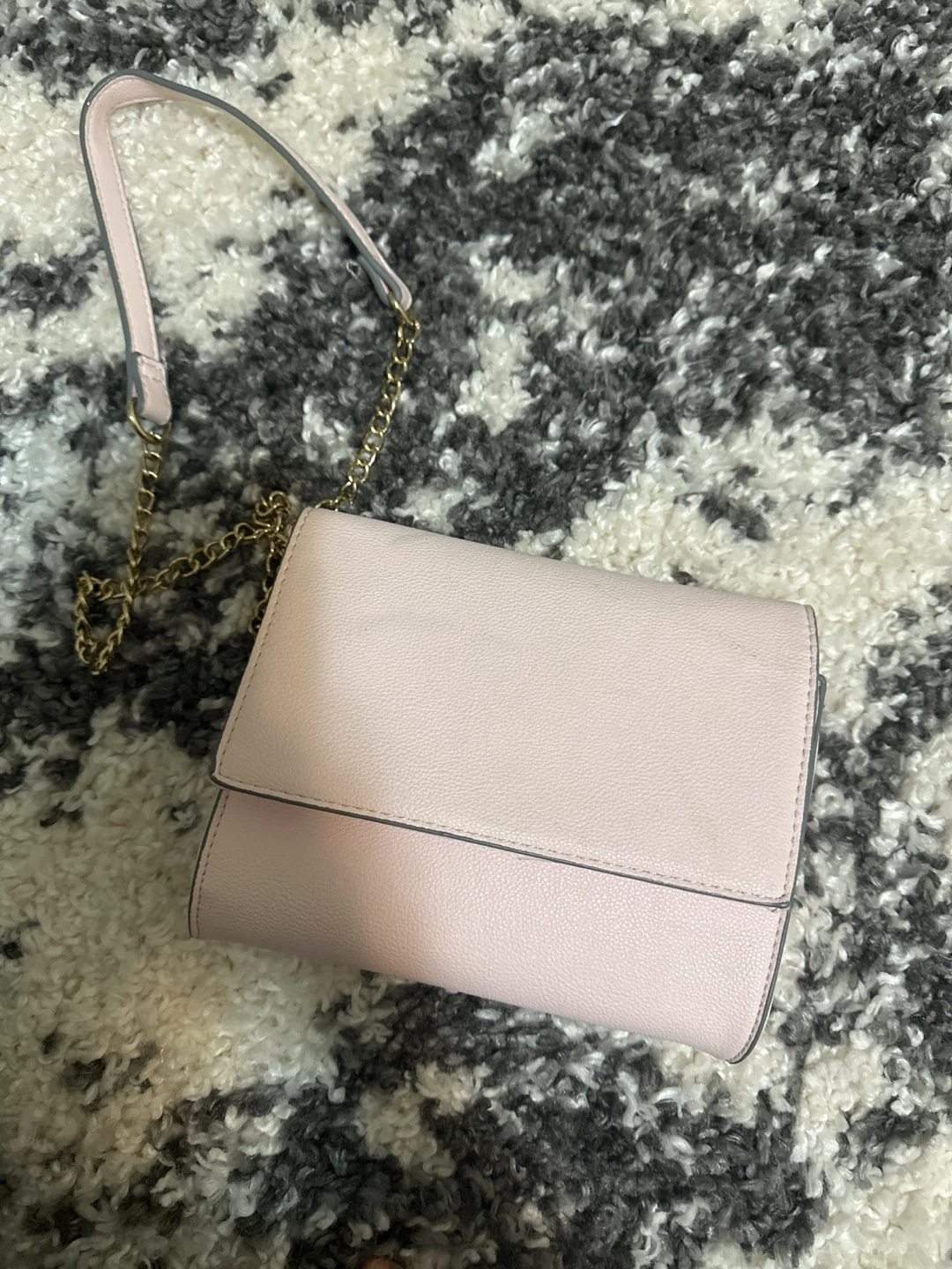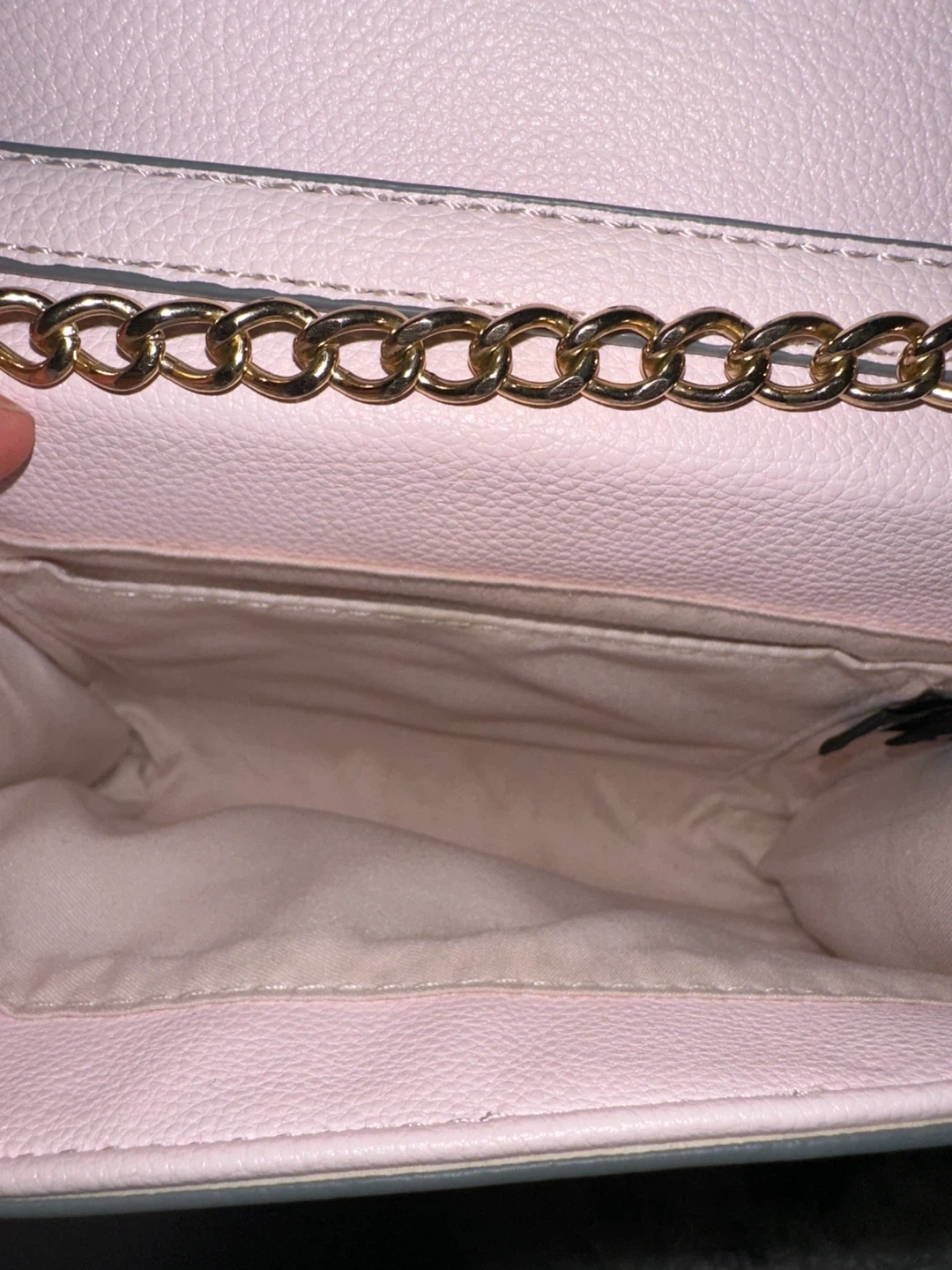 This is a cute pink faux leather crossbody purse. It's got a stylish gold chain strap and a secure flap closure. Plenty of room inside for your essentials!