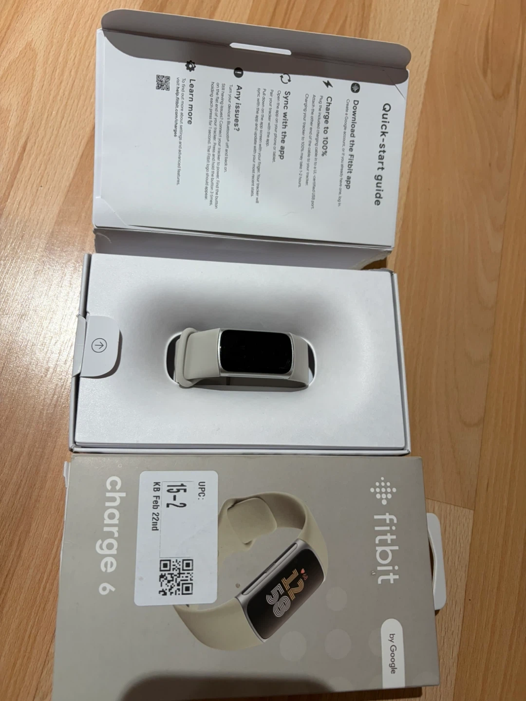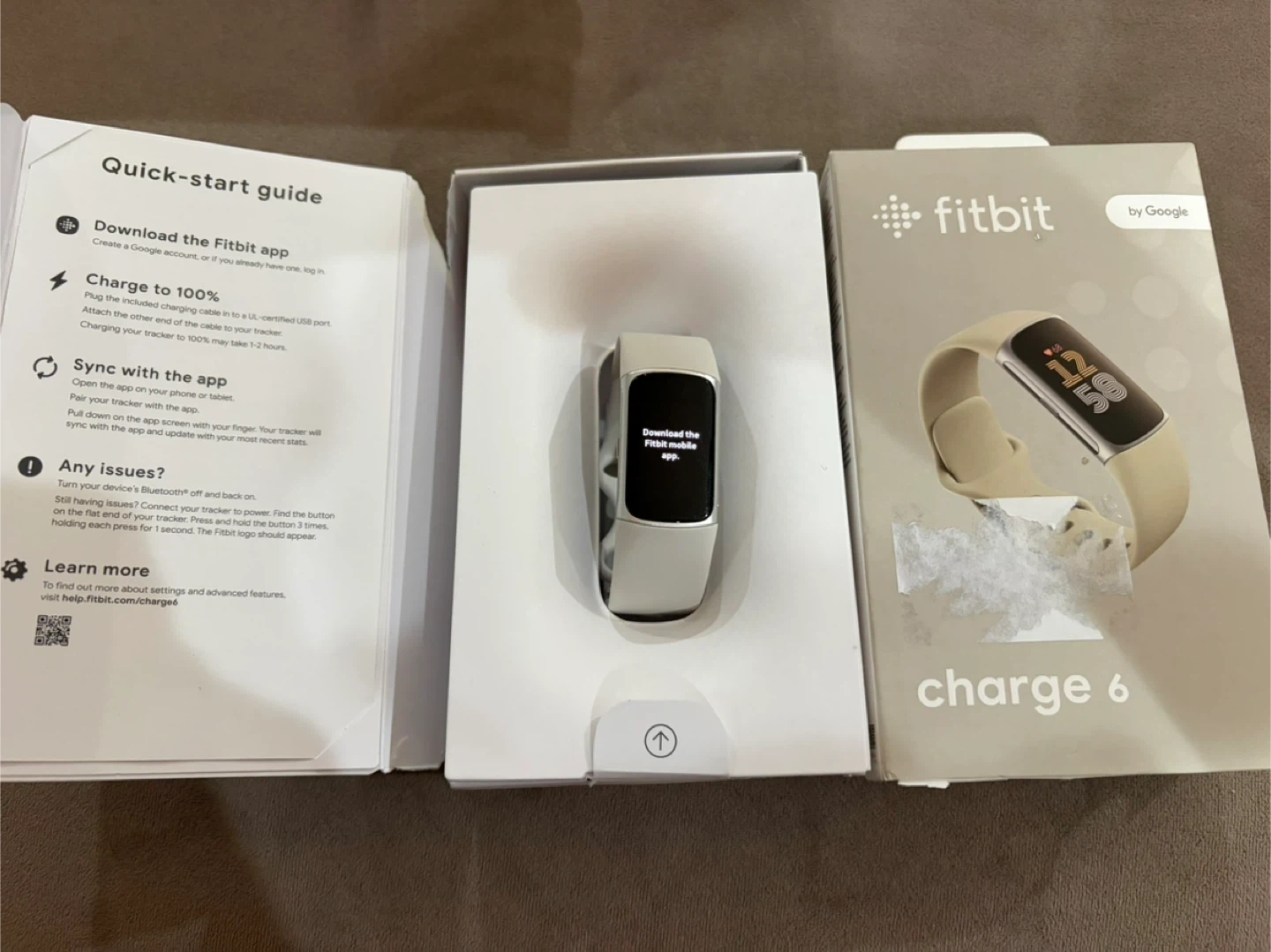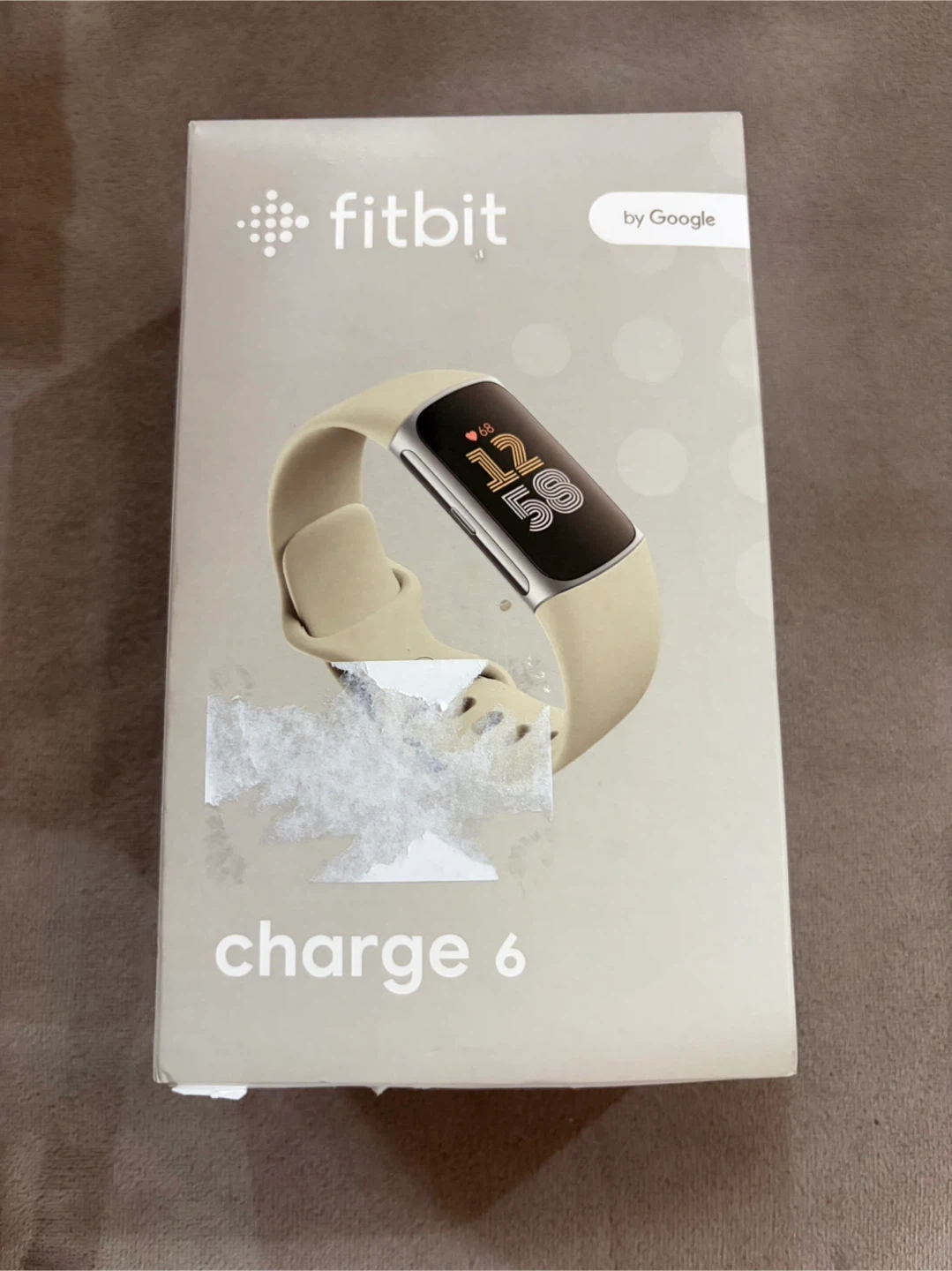 This Fitbit Charge 6 fitness tracker comes in a stylish beige colour. It's designed to help you monitor your activity and health. Includes the original box and quick-start guide.