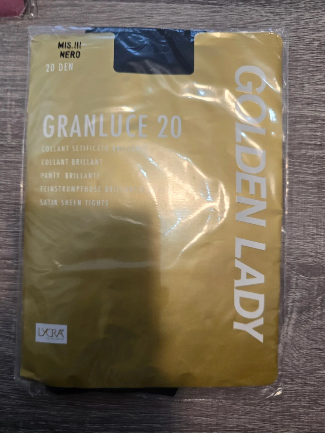Golden Lady Granluce 20 denier sheer tights in a medium size. These tights feature a satin sheen finish. Made in Italy from 87% polyamide, 13% elastane.
