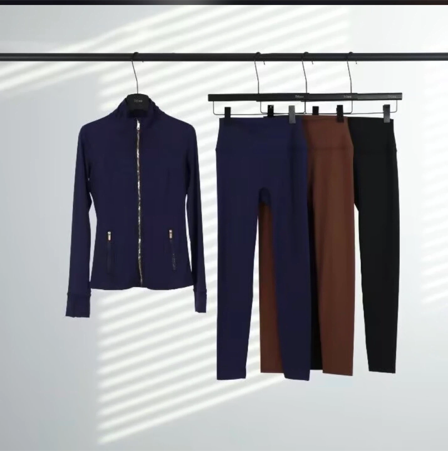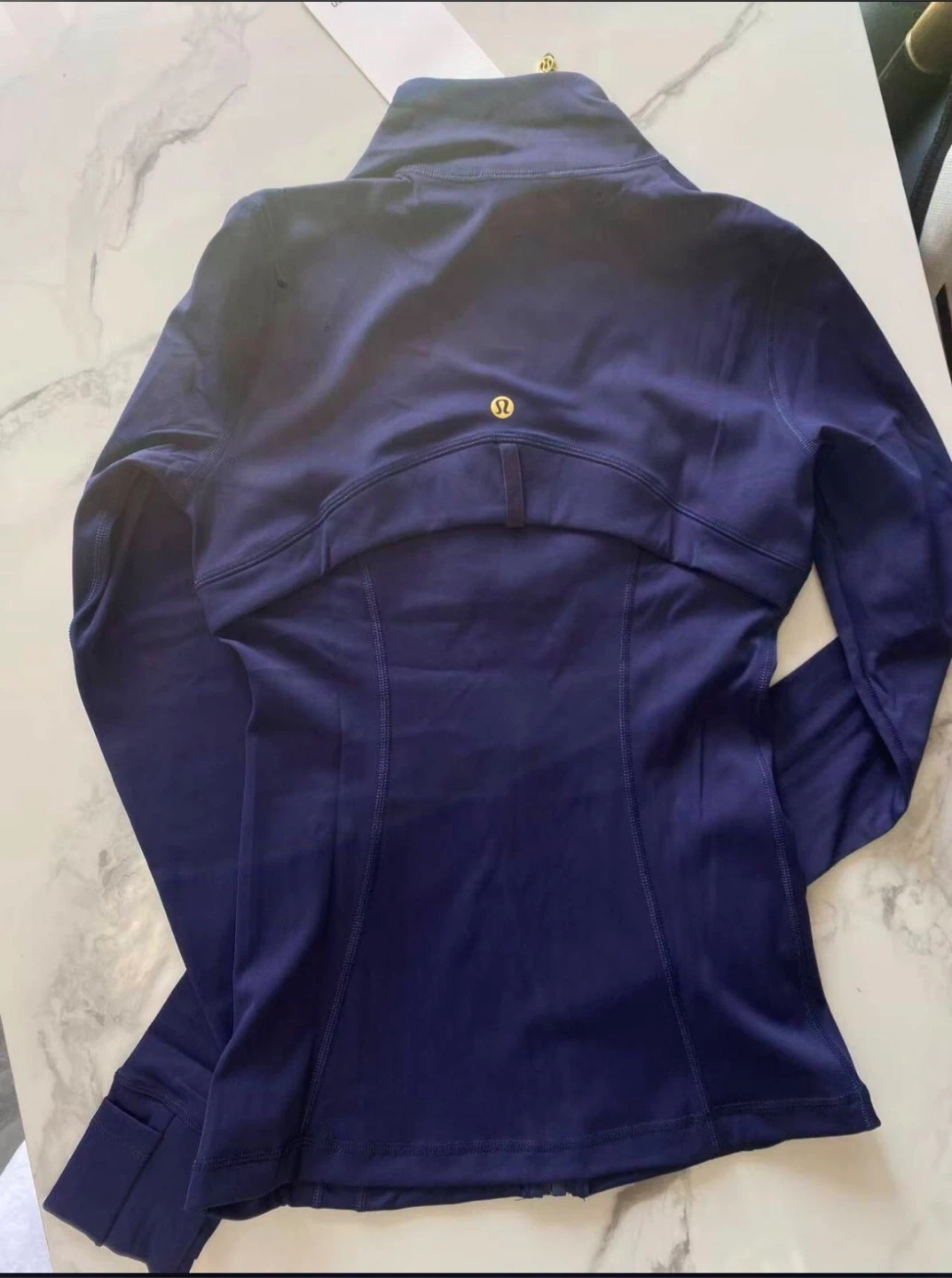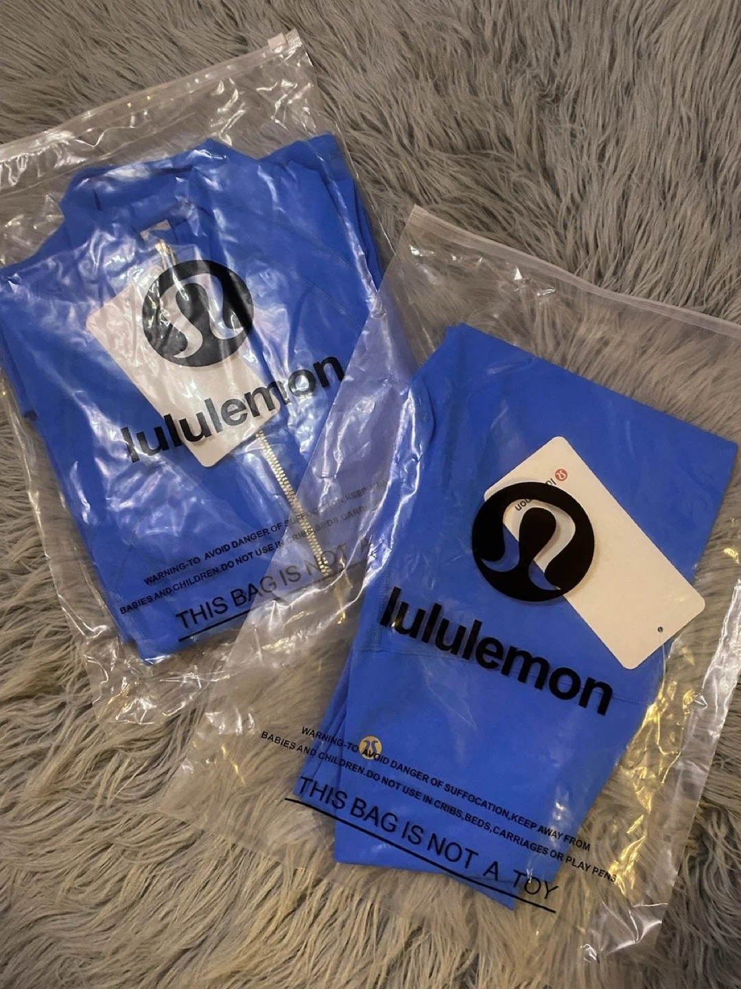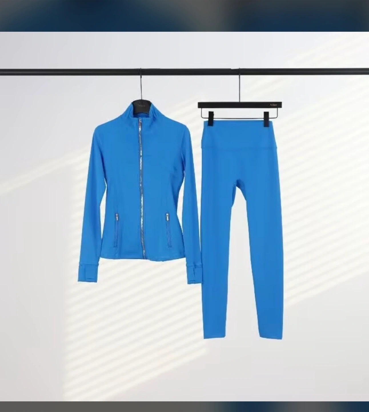 This Lululemon set includes a zip-up athletic jacket and matching leggings. Both pieces are in a vibrant royal blue colour. They're perfect for workouts or athleisure wear!