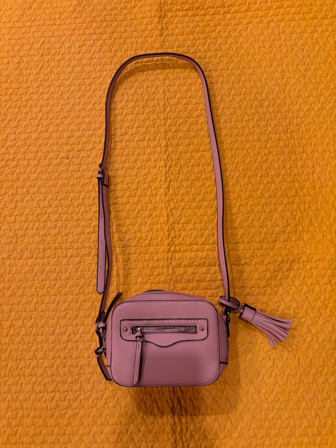 Small pink crossbody bag with gold hardware and a tassel. Adjustable strap. Interior pocket.