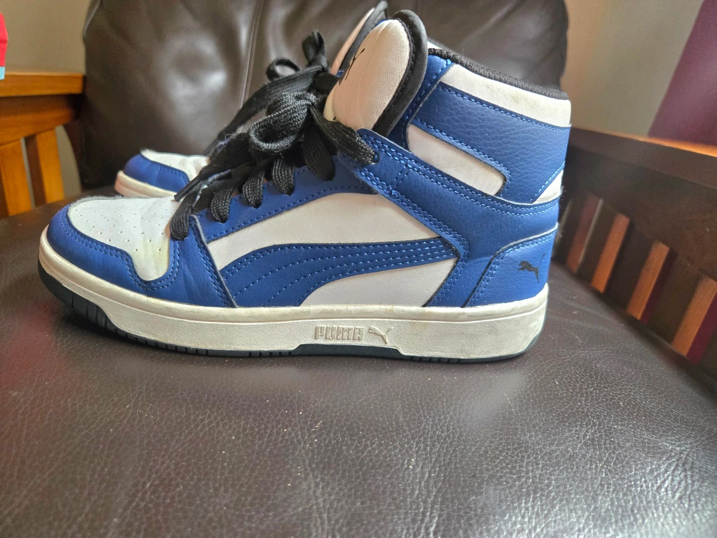 10Description: Stylish PUMA Rebound Layup High Top Sneakers in a clean blue and white colorway. These sneakers feature a classic basketball-inspired design with the signature PUMA logo on the side and tongue. Comfortable padded collar and durable rubber sole for all-day wear. Brand: PUMA Model: Rebound Layup High Top Color: Blue / White Size: US 5C (EU 37 / UK 4 / 23 CM) Condition: Gently used, cleaned, and ready to wear Material: Synthetic leather upper, rubber outsole Style code: 370486-19 Perfect for casual outfits or streetwear looks — classic, sporty, and comfortable!