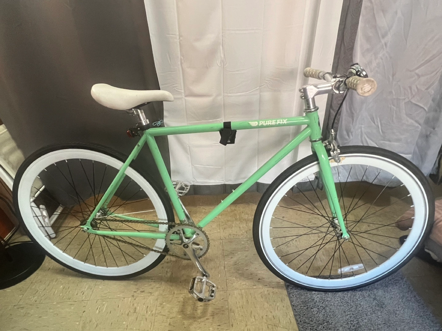 Green fixed gear bike with white wall tires. Comes with a kickstand.