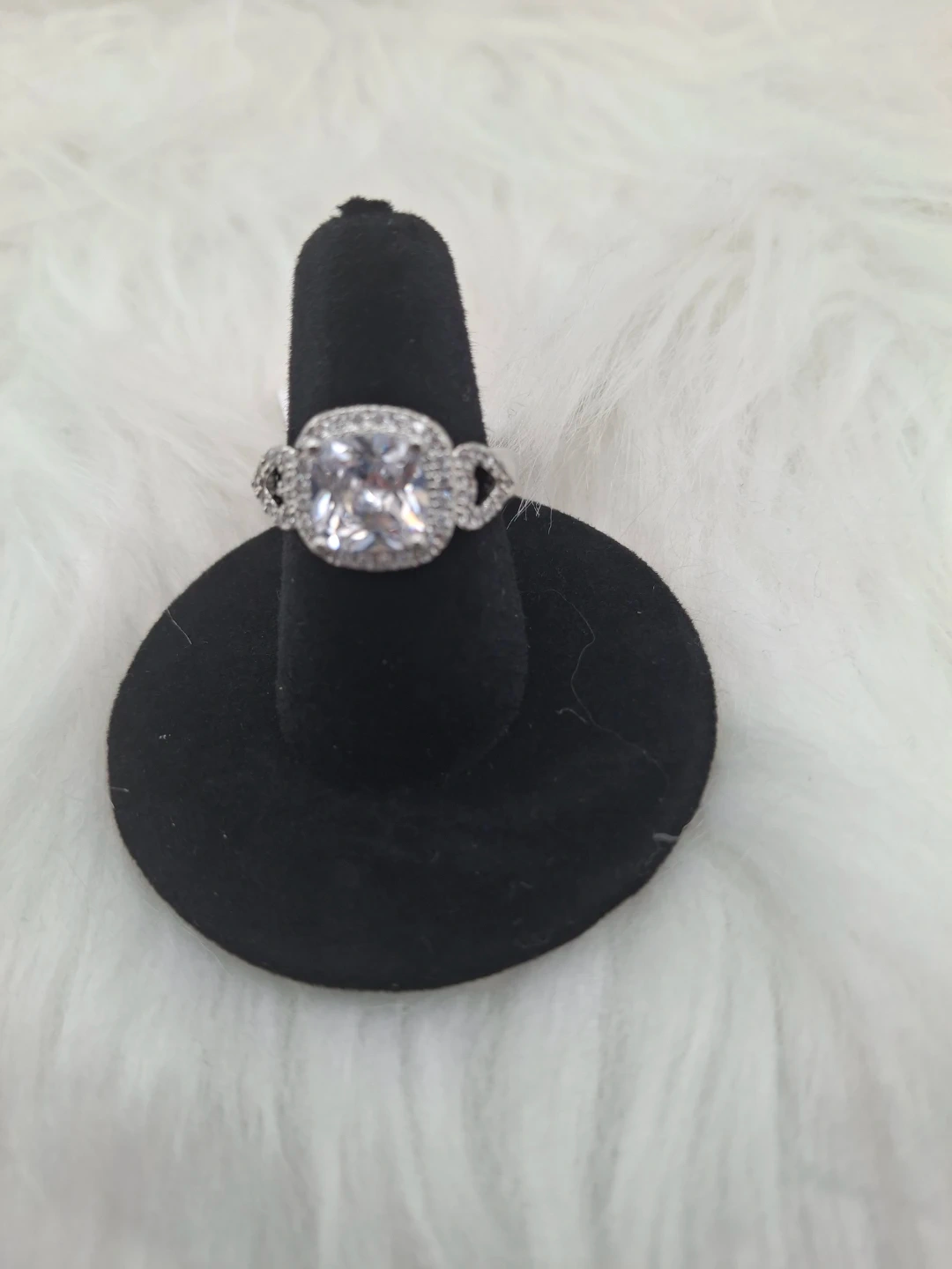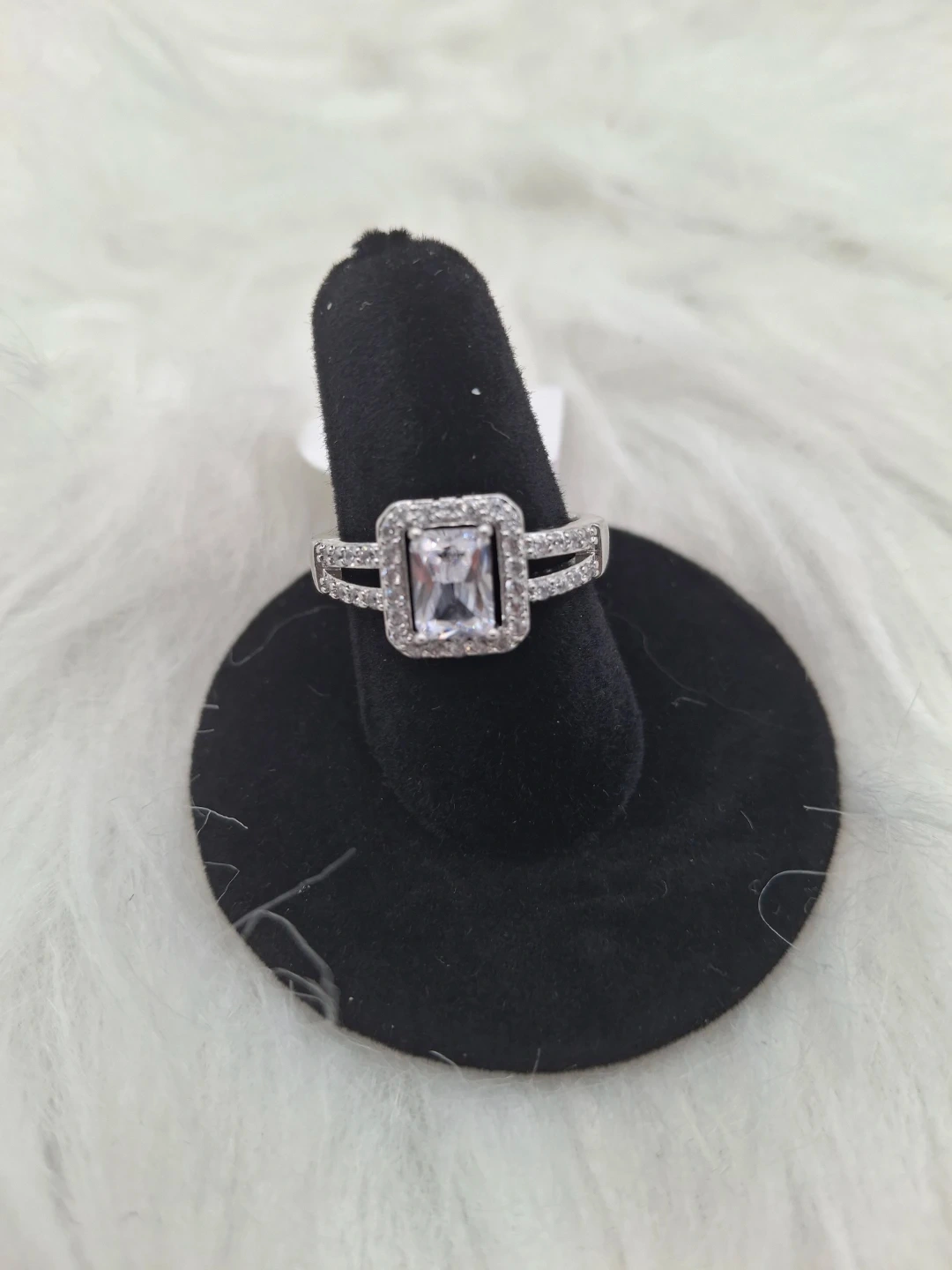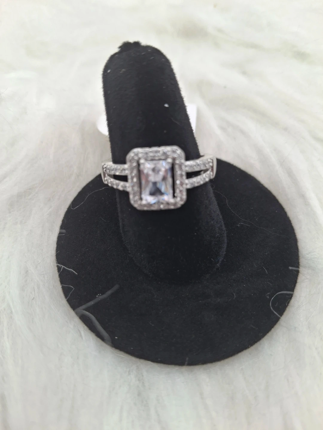 This ring features a central clear rectangular stone surrounded by smaller clear stones. It's set in a silver-toned metal with a split band design. It's a lovely statement piece for any occasion!