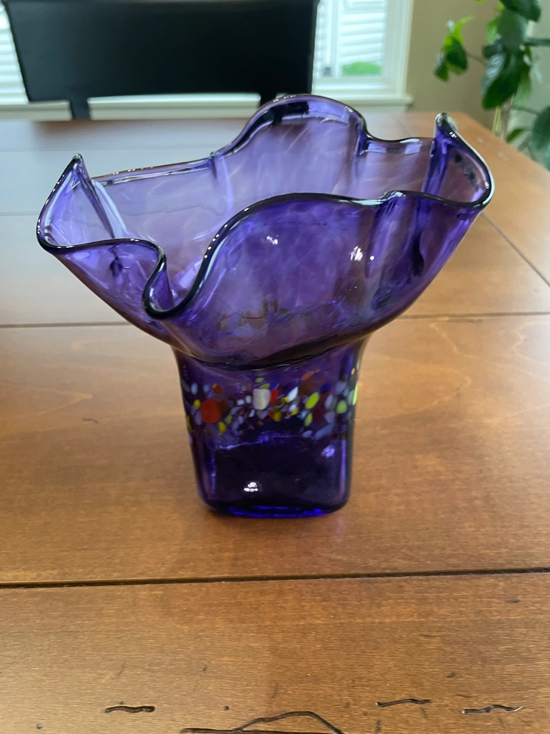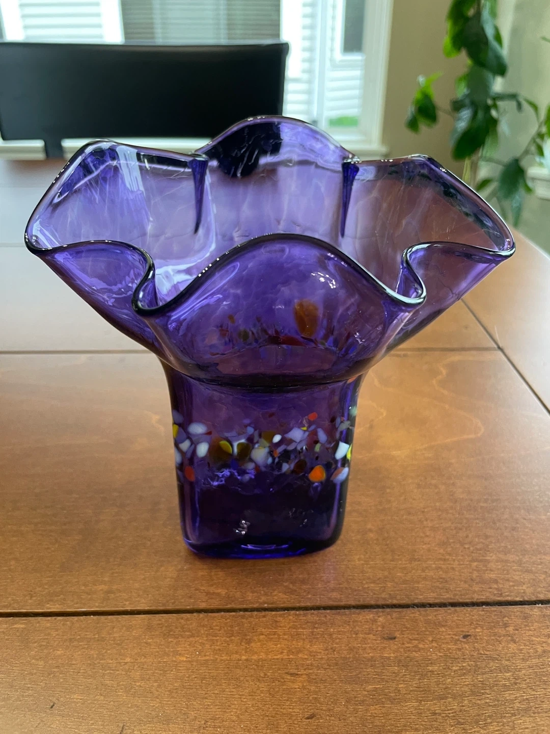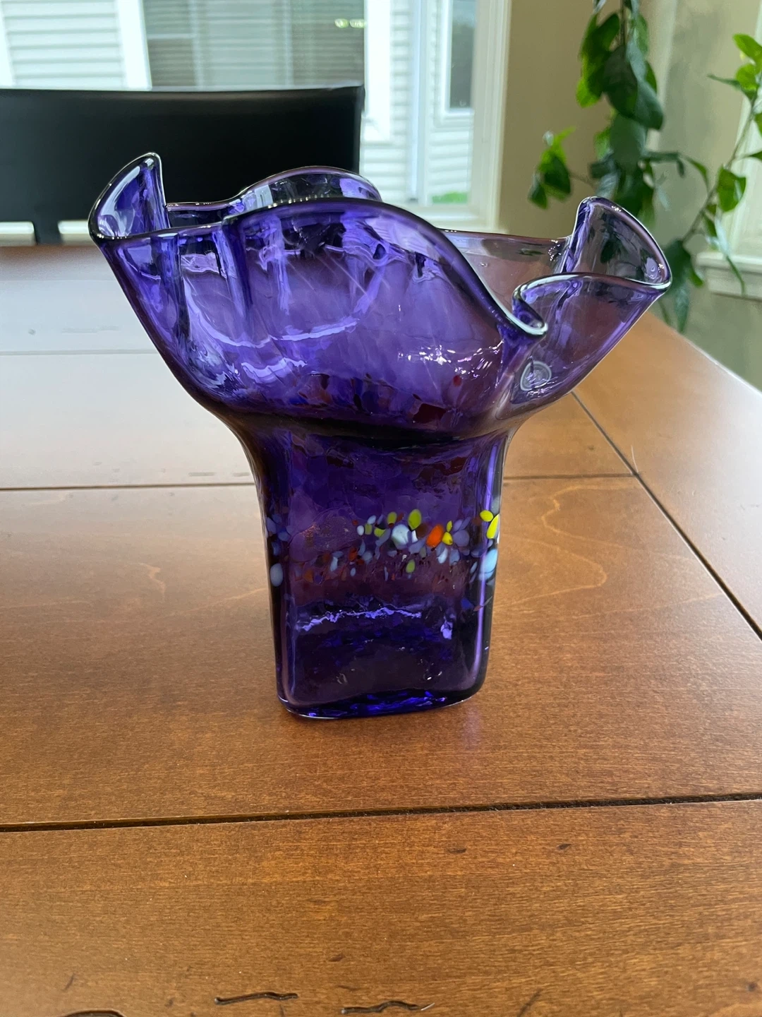65Beautiful purple art glass vase with a unique ruffled edge and colorful accents near the base. It's in excellent condition and would look lovely in any home!