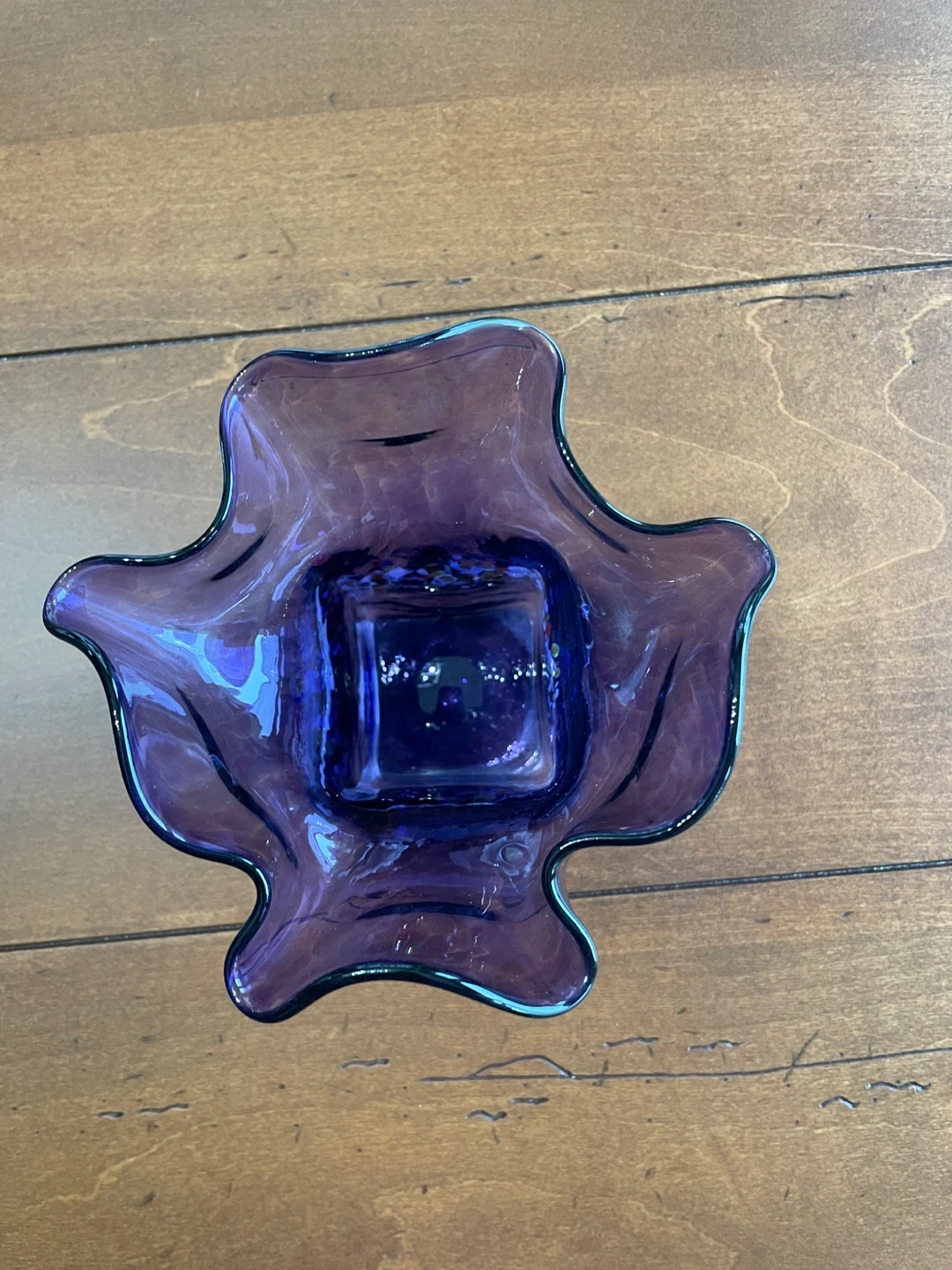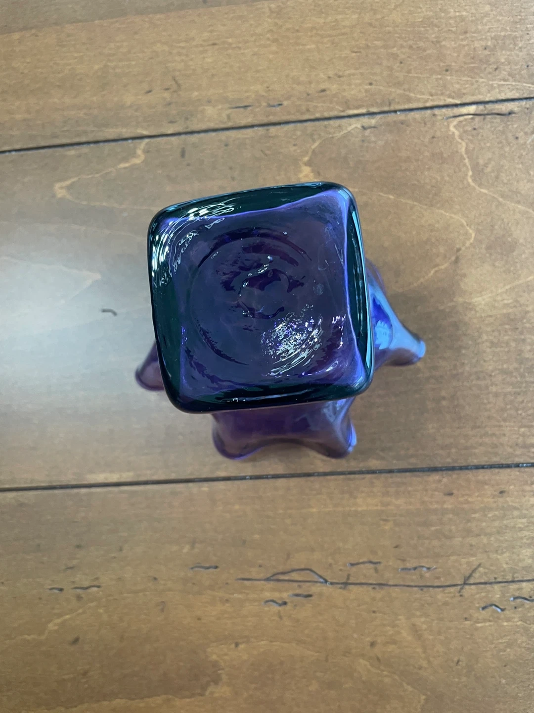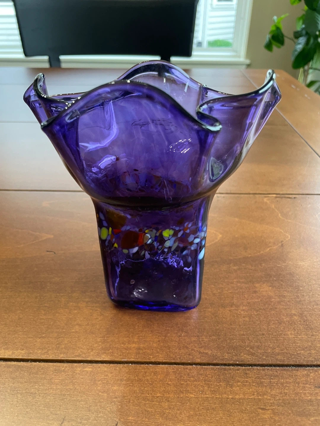 65Beautiful purple art glass vase with a unique ruffled edge and colorful accents near the base. It's in excellent condition and would look lovely in any home!