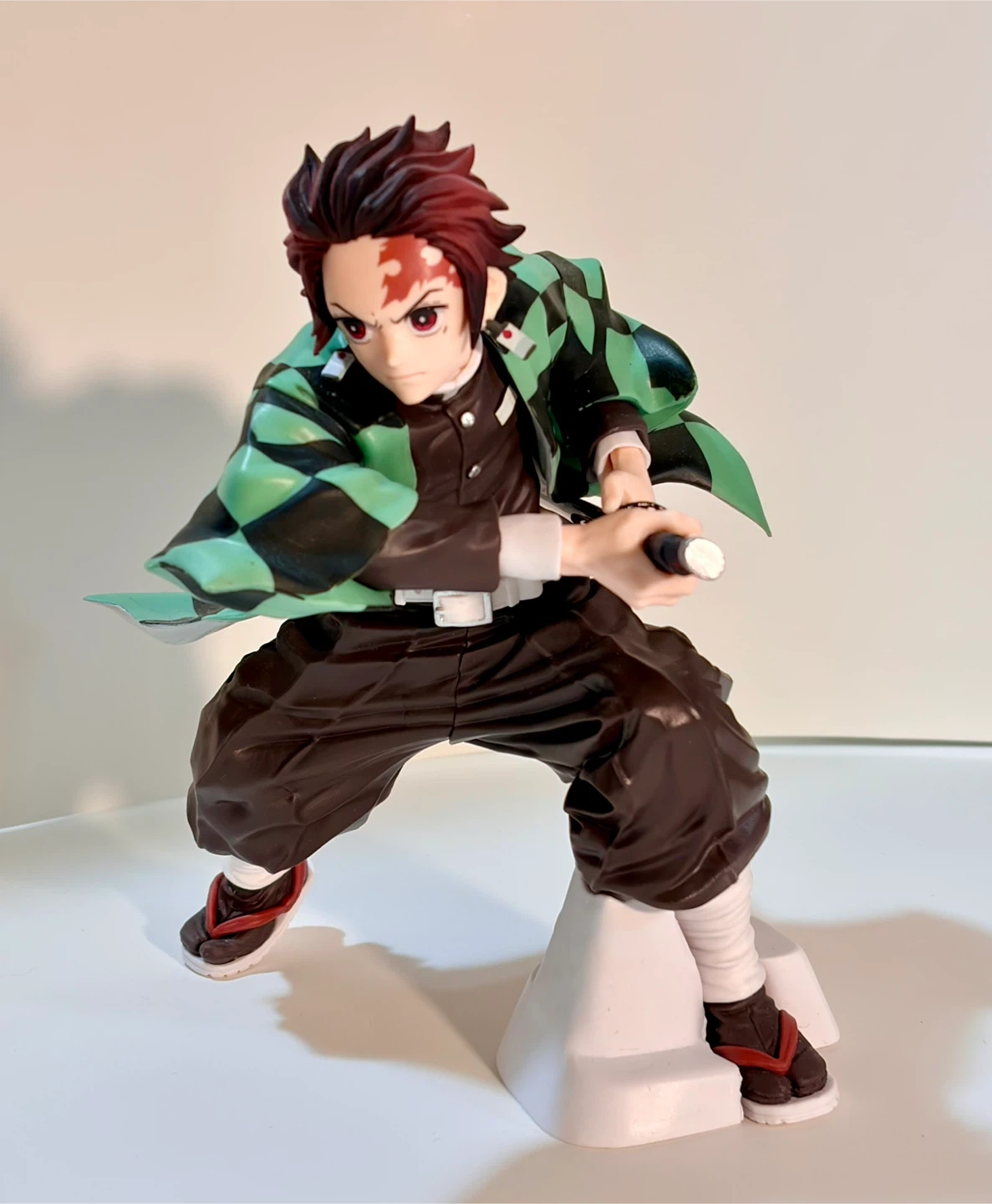 This is a detailed action figure of Tanjiro Kamado from Demon Slayer. It features his signature checkered haori and sword. Stands on a white display base.