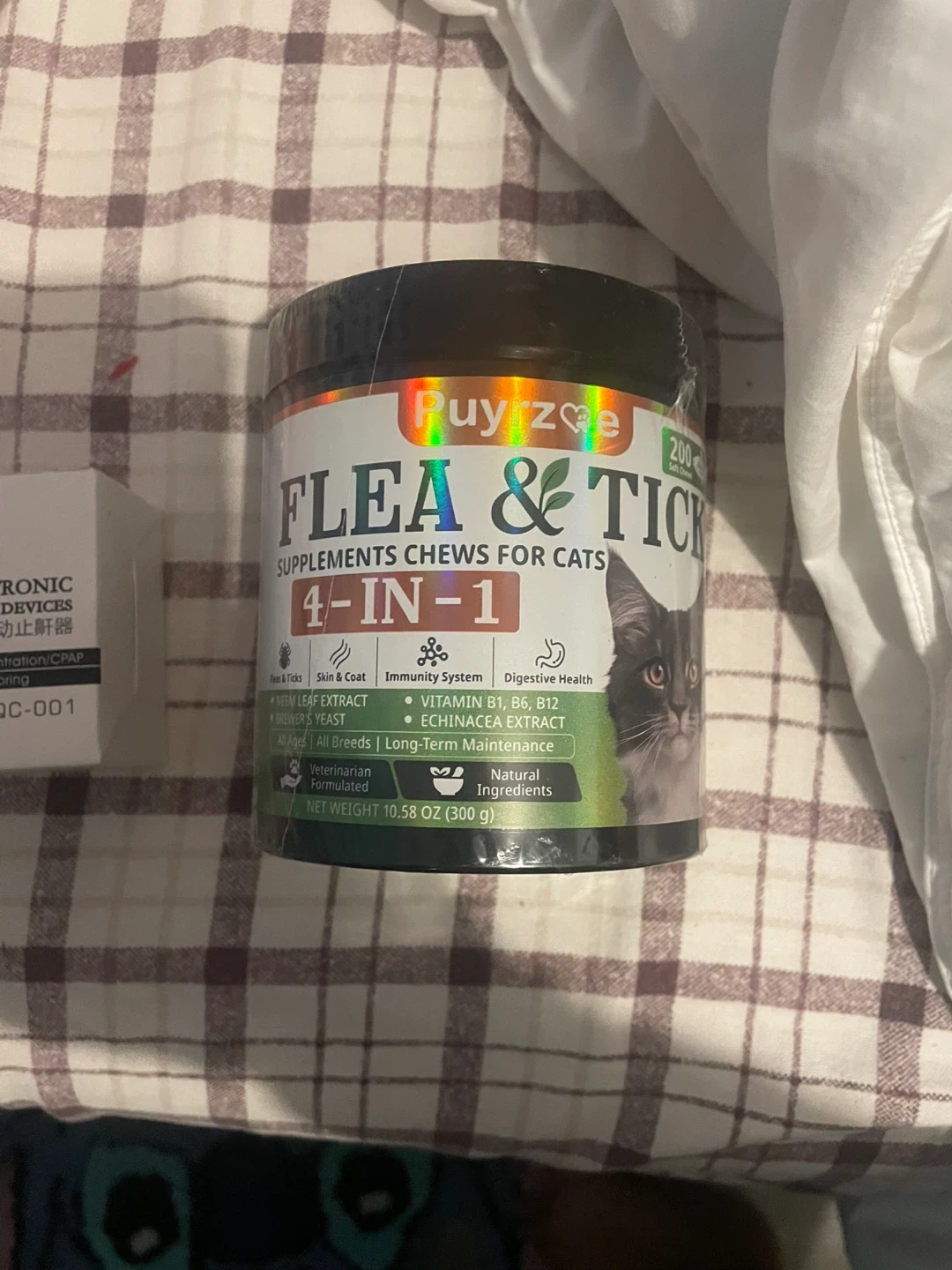 I'm selling Puyrze Flea & Tick Supplements Chews for Cats. It's a 4-in-1 formula with neem leaf extract, brewer's yeast, vitamin B1, B6, B12, and echinacea extract. Veterinarian formulated with natural ingredients. Net weight is 10.58 oz (300 g).