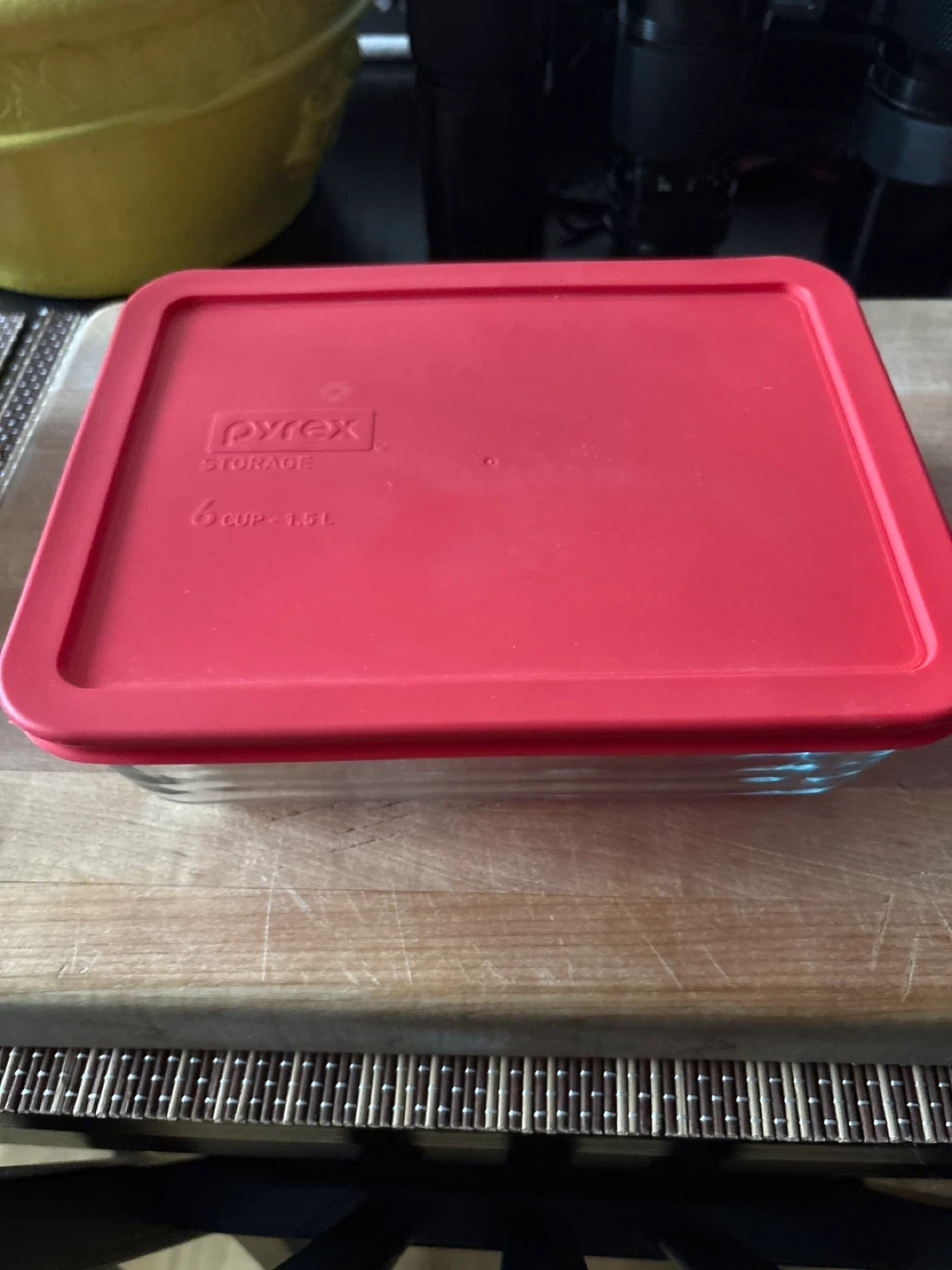 Pyrex glass storage container with a red lid. It holds 6 cups or 1.5 litres. This is a handy dish for storing leftovers or meal prepping!