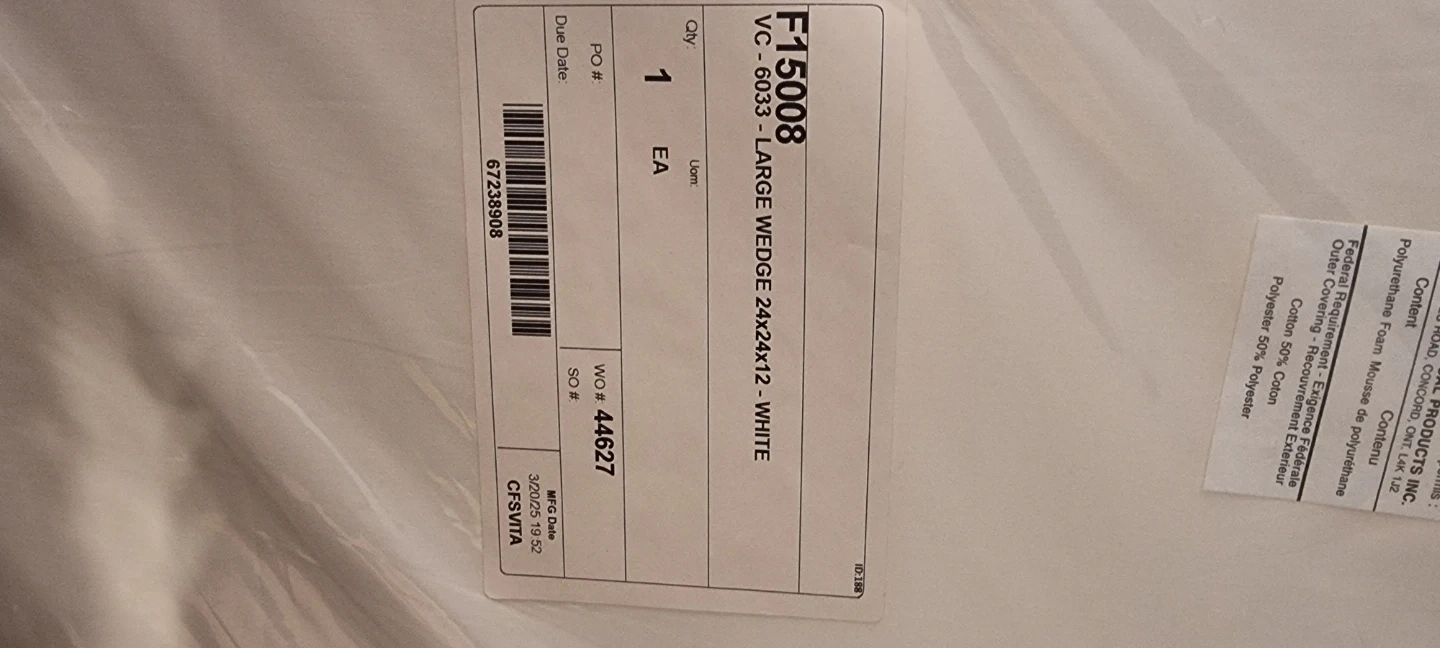 Vita Care Medical Products large wedge. It's 24 inches by 24 inches by 12 inches and white. Made with polyurethane foam. This wedge is useful for elevating the body for comfort or medical needs.
