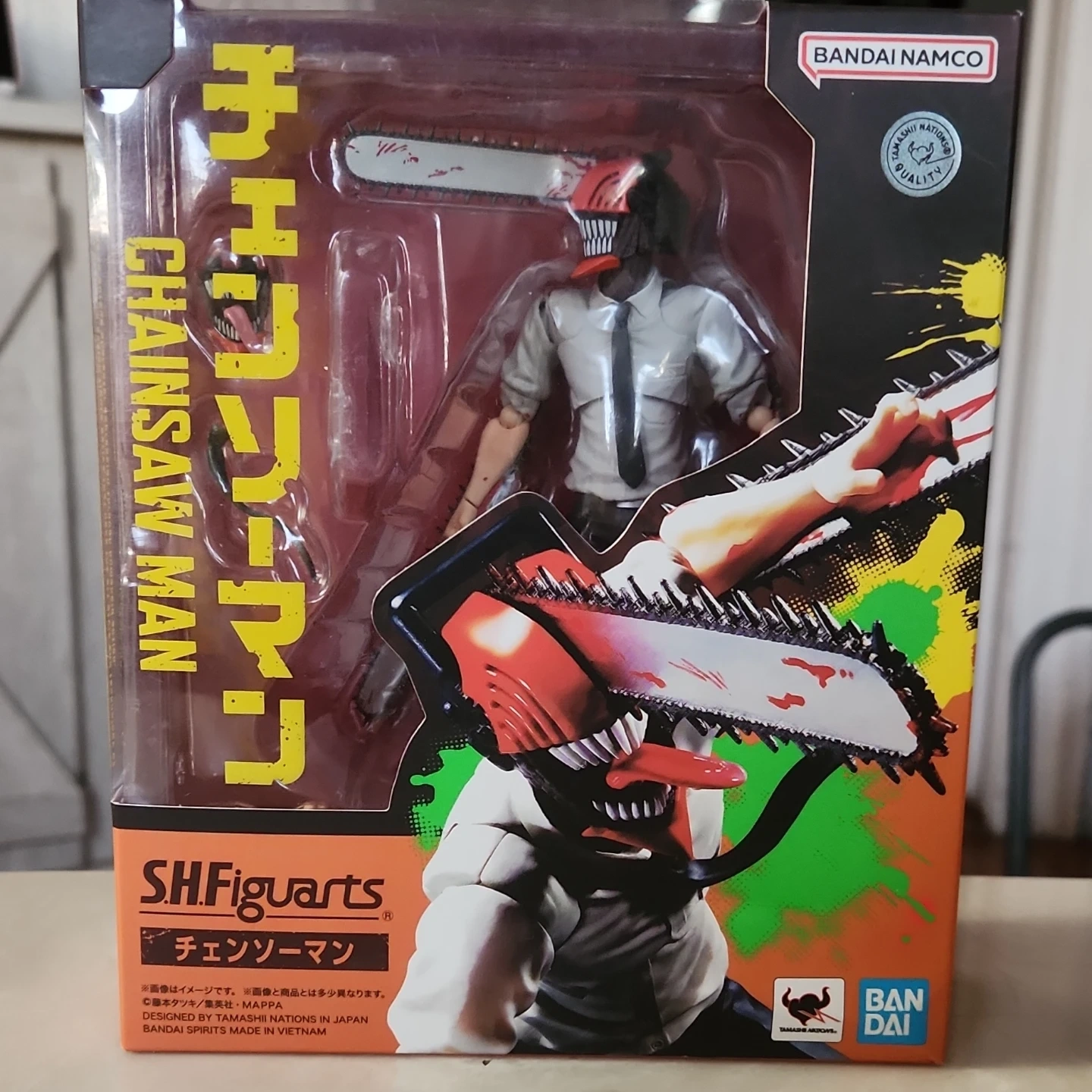 This is an S.H.Figuarts action figure of Chainsaw Man. It's designed by Tamashii Nations in Japan and made by Bandai Spirits in Vietnam. The figure comes in its original packaging.