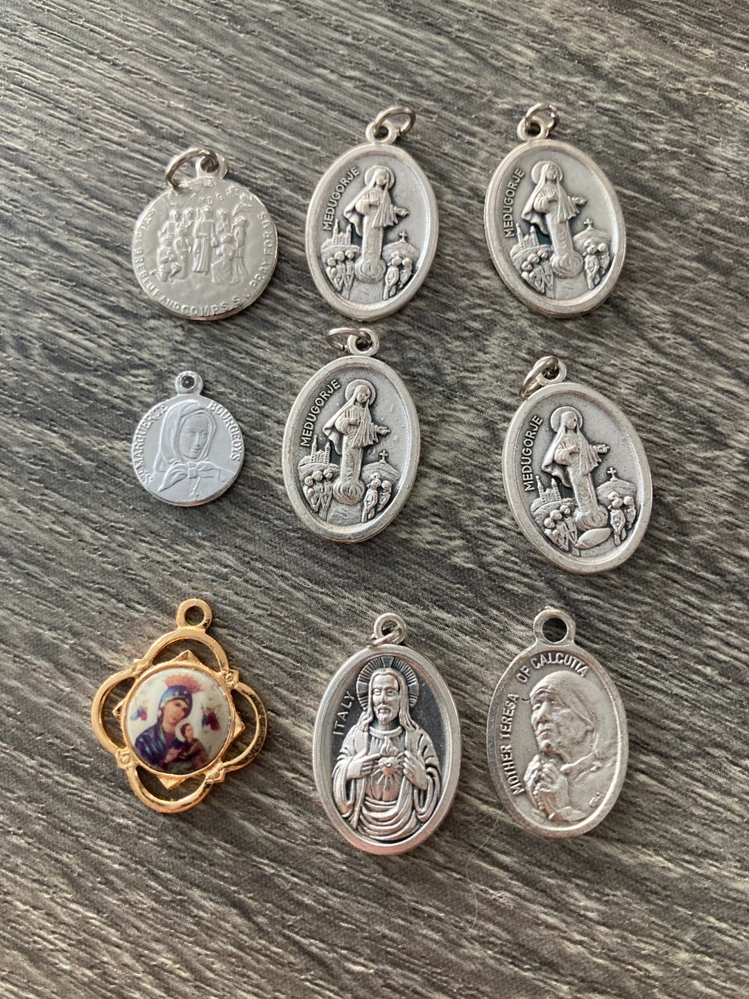 This lot includes several religious medals featuring various depictions. One medal has a group of figures and reads 'ST. THERESE OF LISIEUX PRAY FOR US'. Other medals display 'MEDUGORJE'. There's also a medal with Jesus and one with Mother Teresa. One small round medal features a woman and reads 'SENS-MARGUE BOURGEOIS'. A gold-toned clover-shaped medal depicts the Virgin Mary and child. These medals are great for personal devotion or as spiritual gifts.