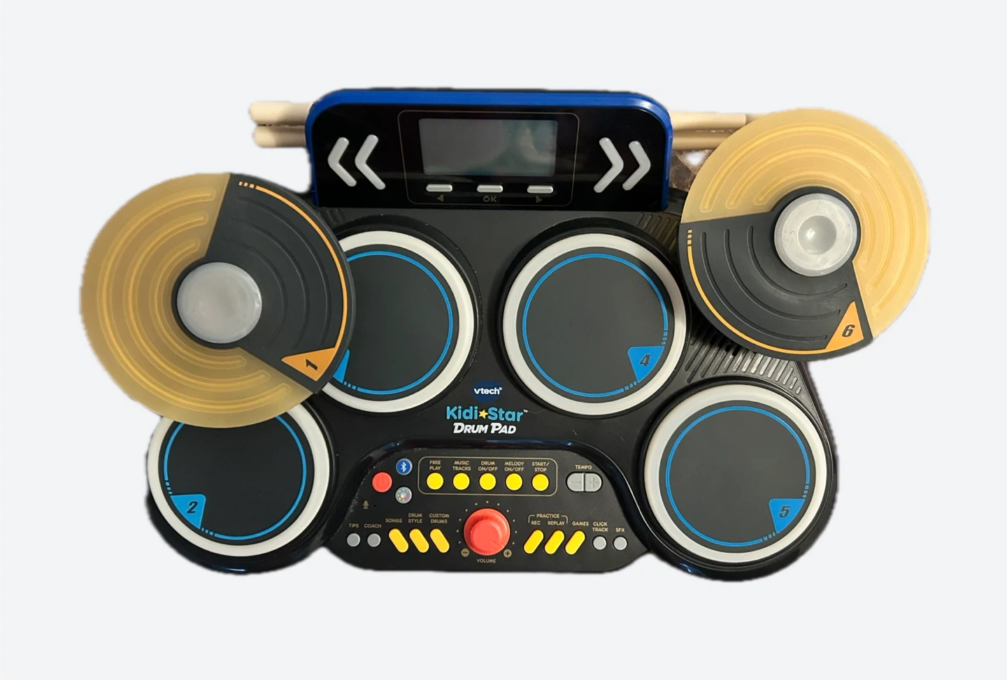 This VTech KidiStar Drum Pad lets kids explore drumming. It has multiple drum pads and cymbals for interactive play. Various modes like free play, music tracks, and games are included.