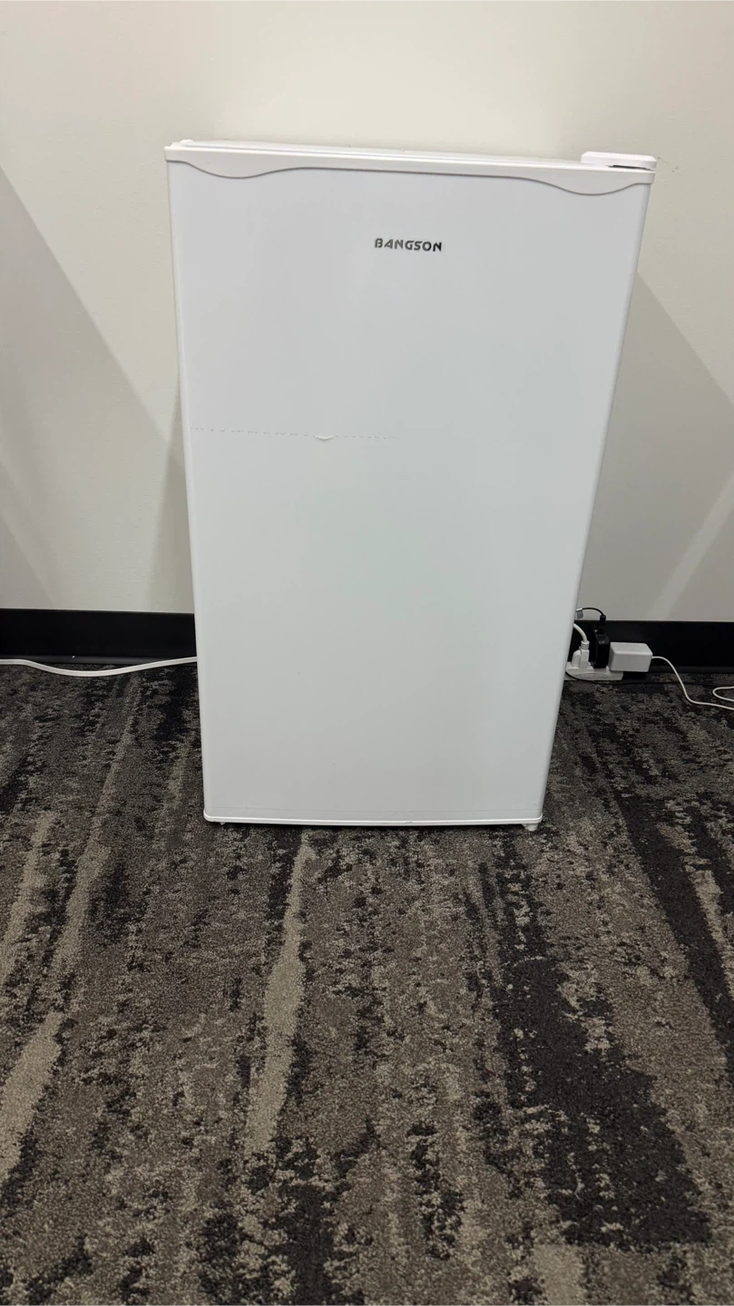 Selling a Bangson mini fridge in white, still with covering plastic! It's perfect for a dorm room, office, or small apartment. It's compact and in great condition, ready to keep your drinks and snacks cool