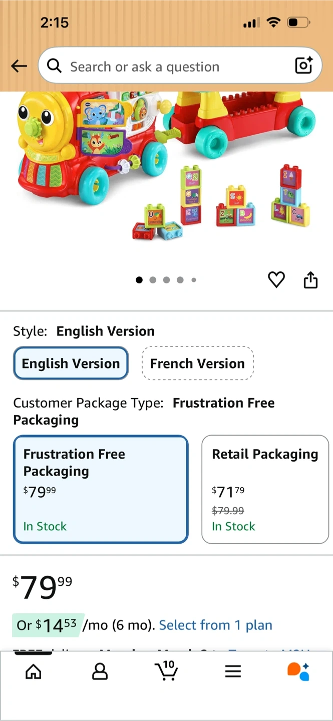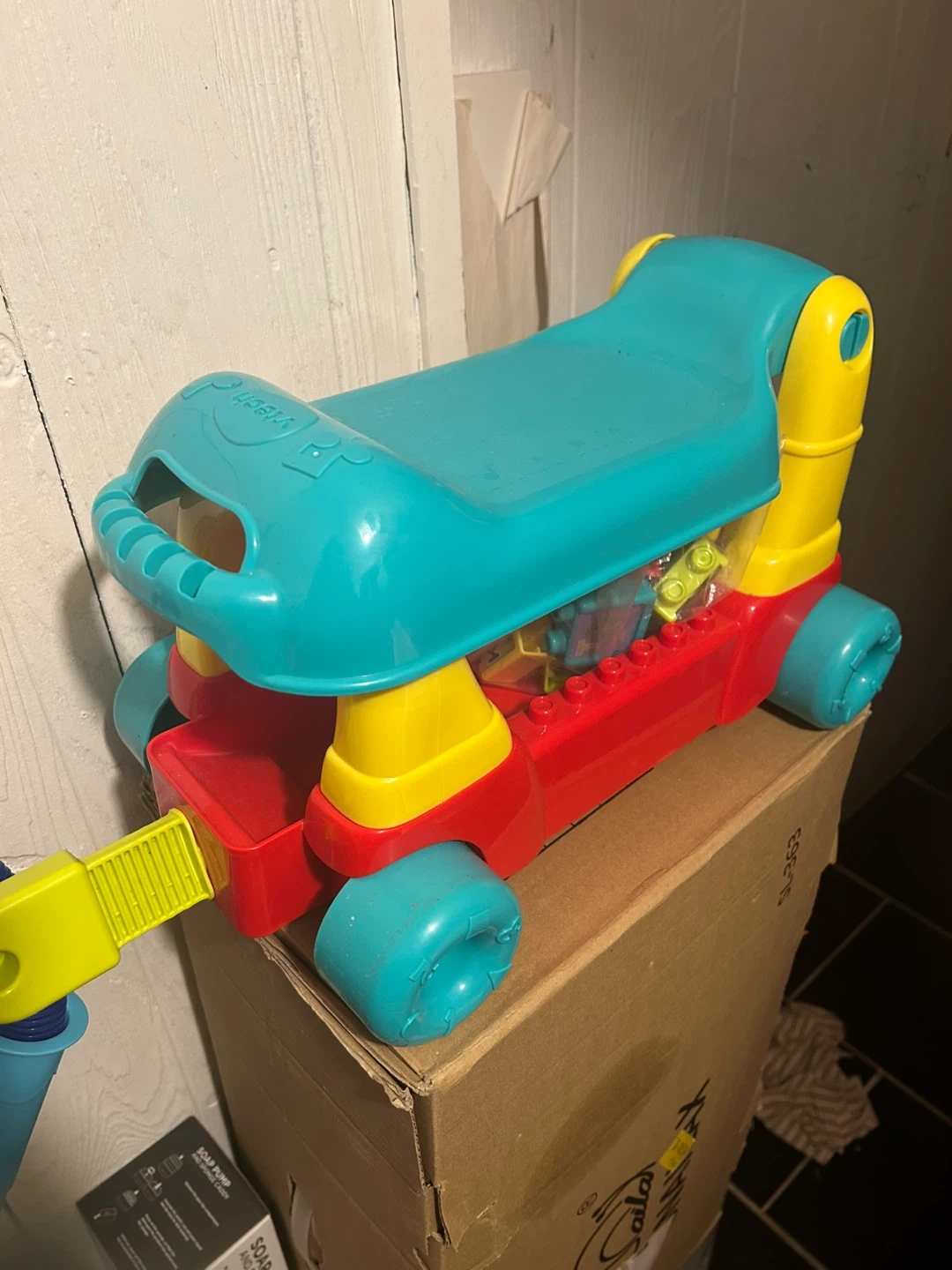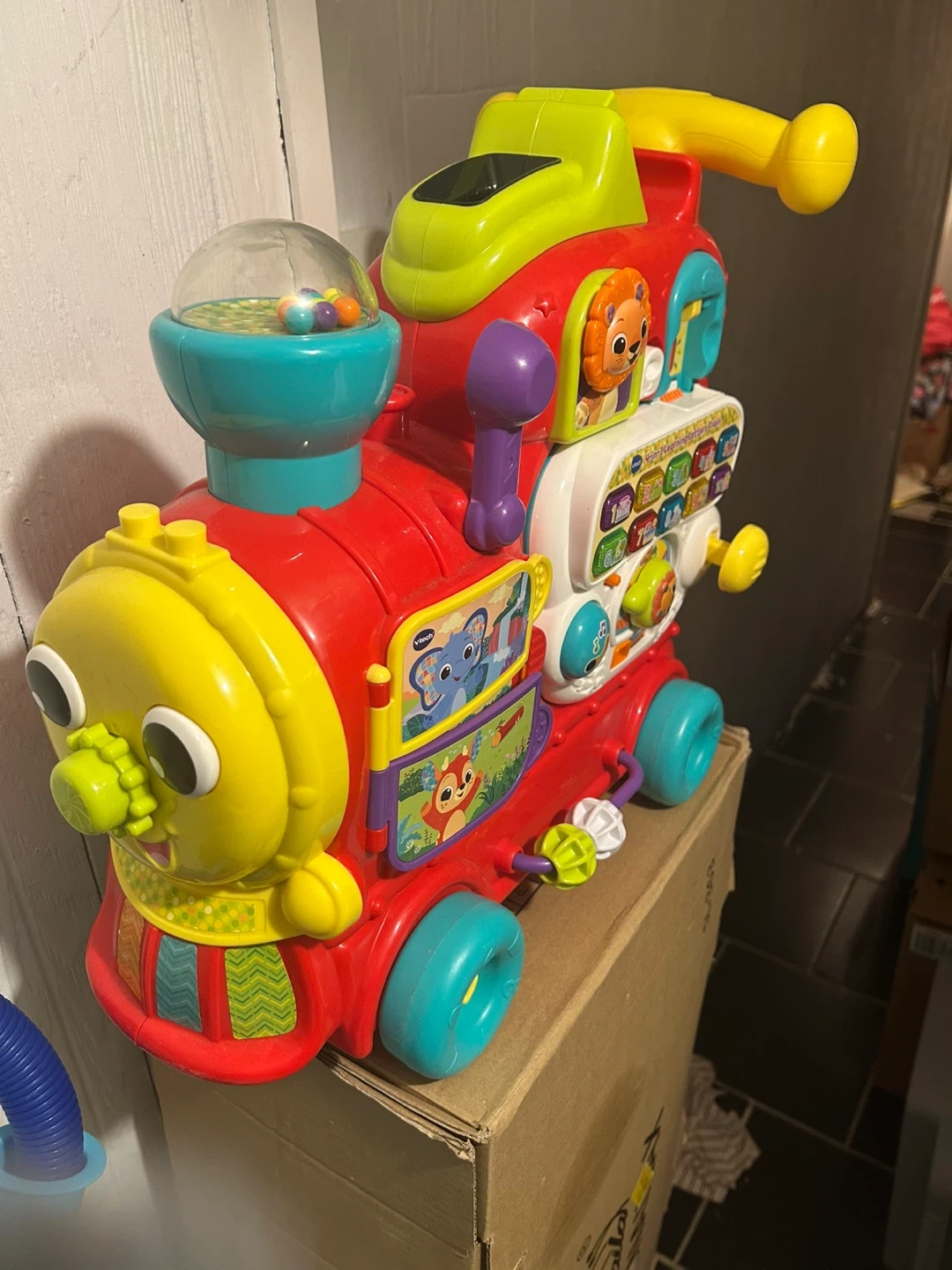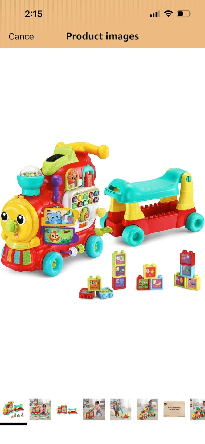 It's a VTech musical train ride-on toy with building blocks. It has lights and sounds for interactive play. Perfect for toddlers learning to walk and play!