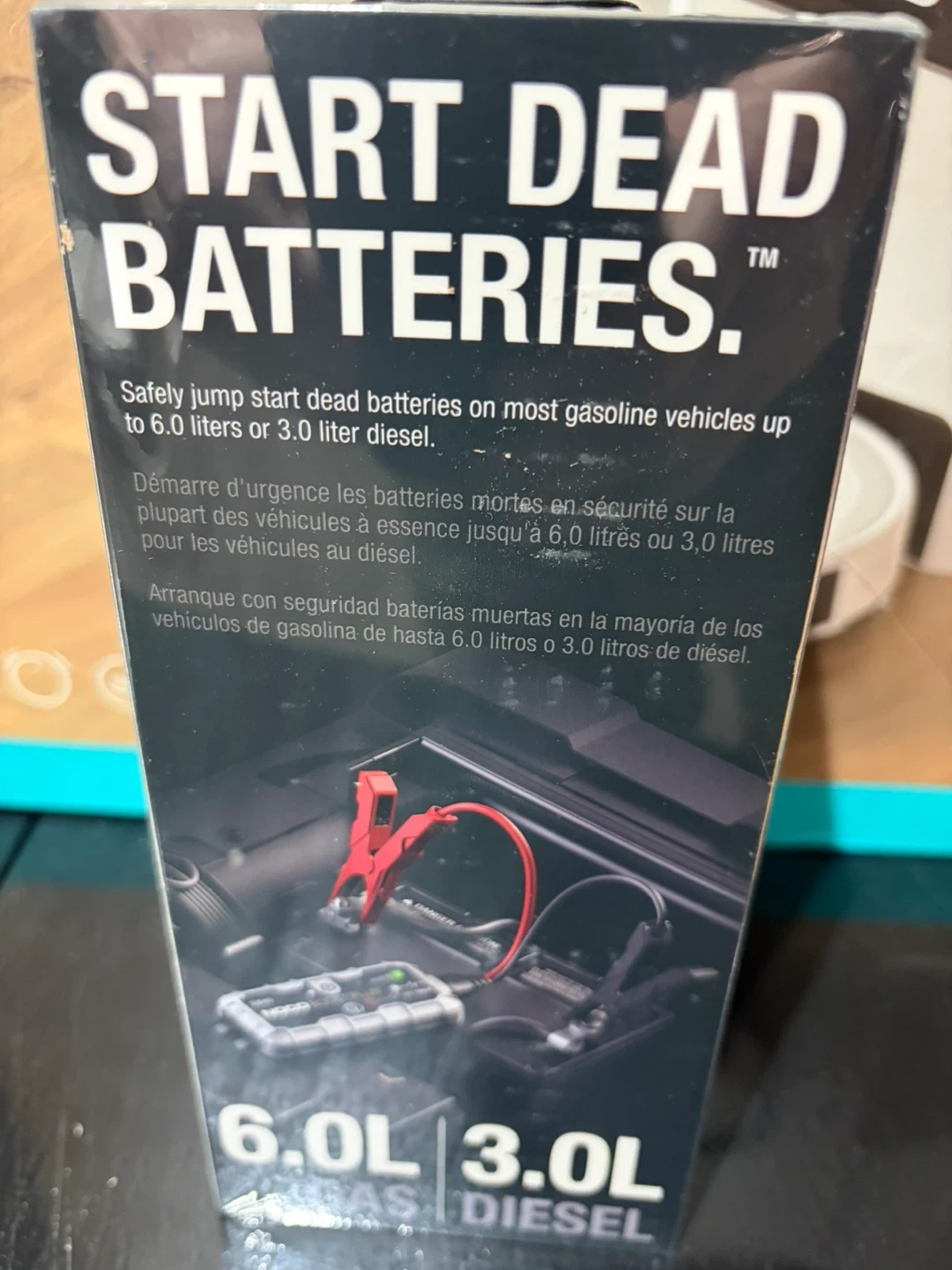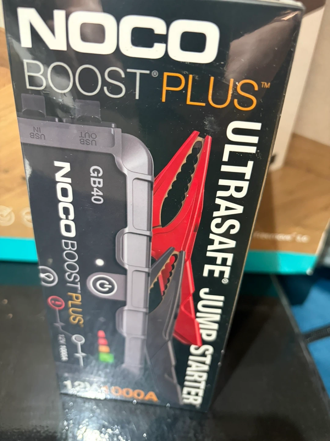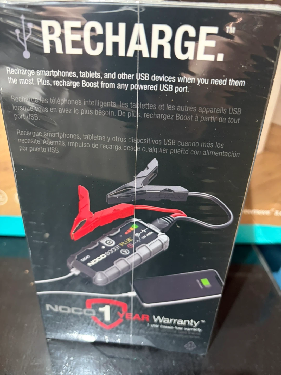 NOCO Boost Plus GB40 jump starter. Safely jump start dead batteries on most gasoline vehicles up to 6.0 liters or 3.0 liter diesel. It also recharges smartphones, tablets and other USB devices. Includes a 100 Lumen LED flashlight. 12V 1000A.