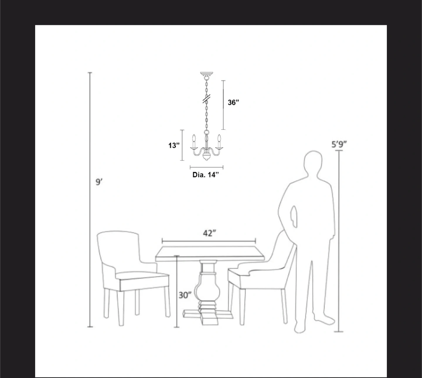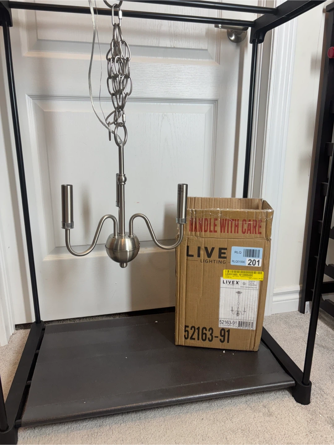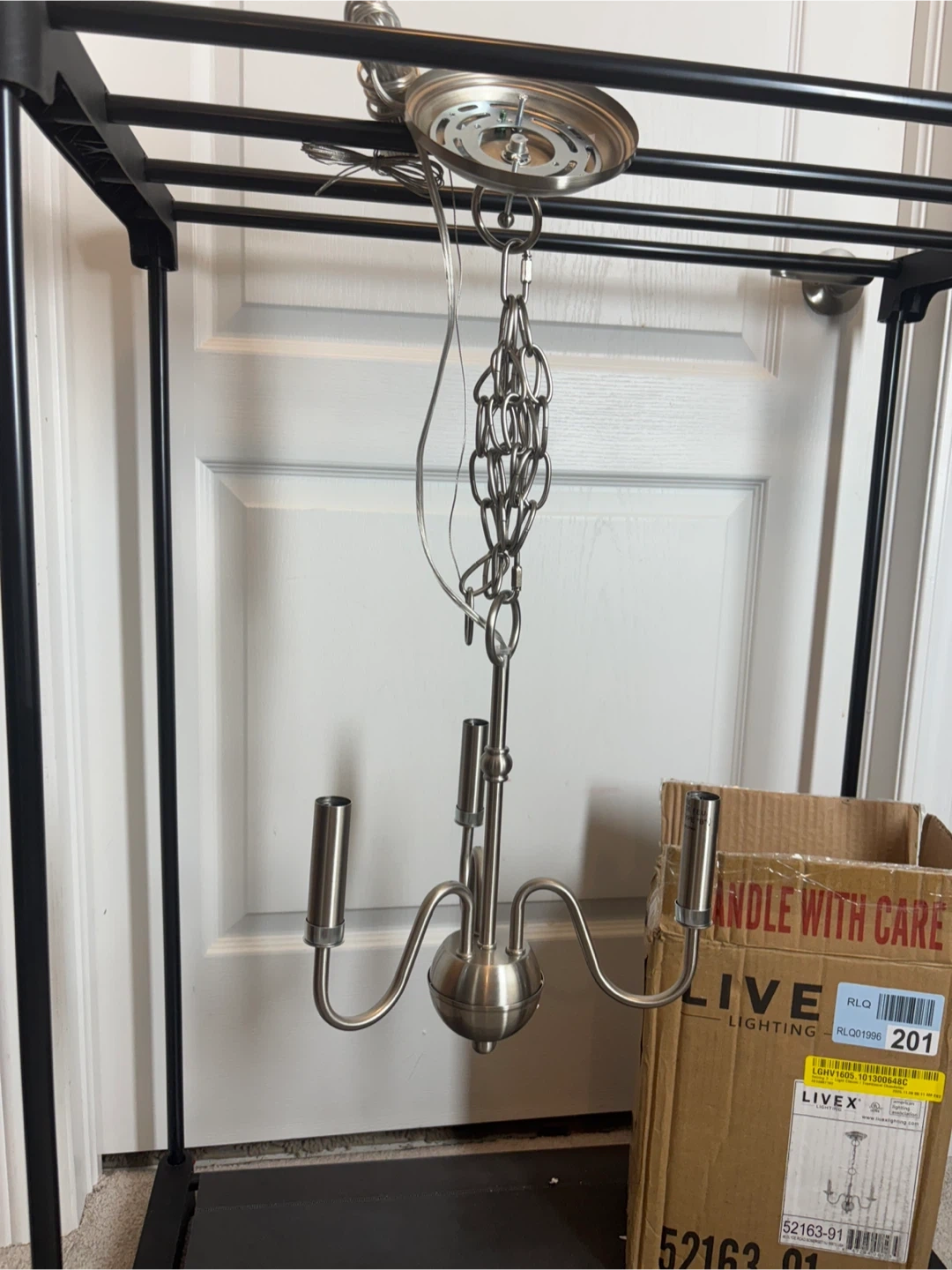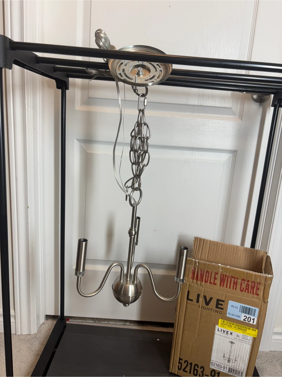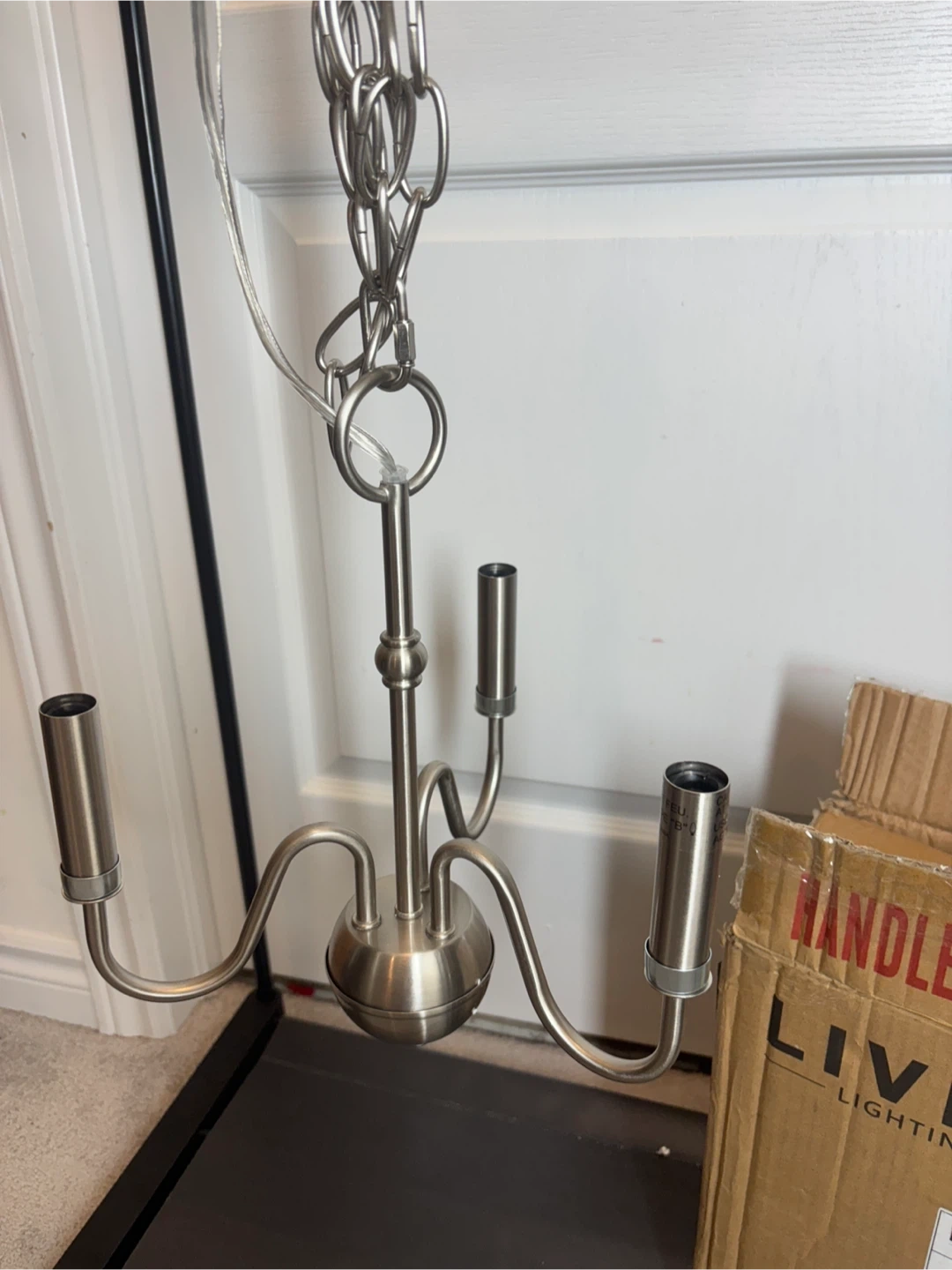 Selling a Three Posts ceiling chandelier. It's a classic, traditional style with three lights. The dimensions are approximately 36" in height and 14" in diameter.