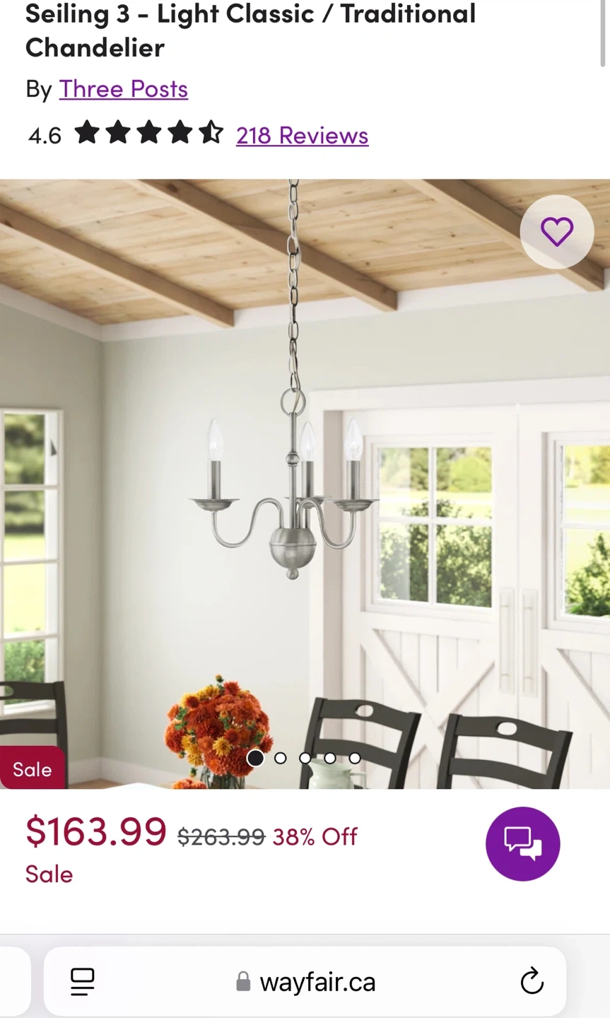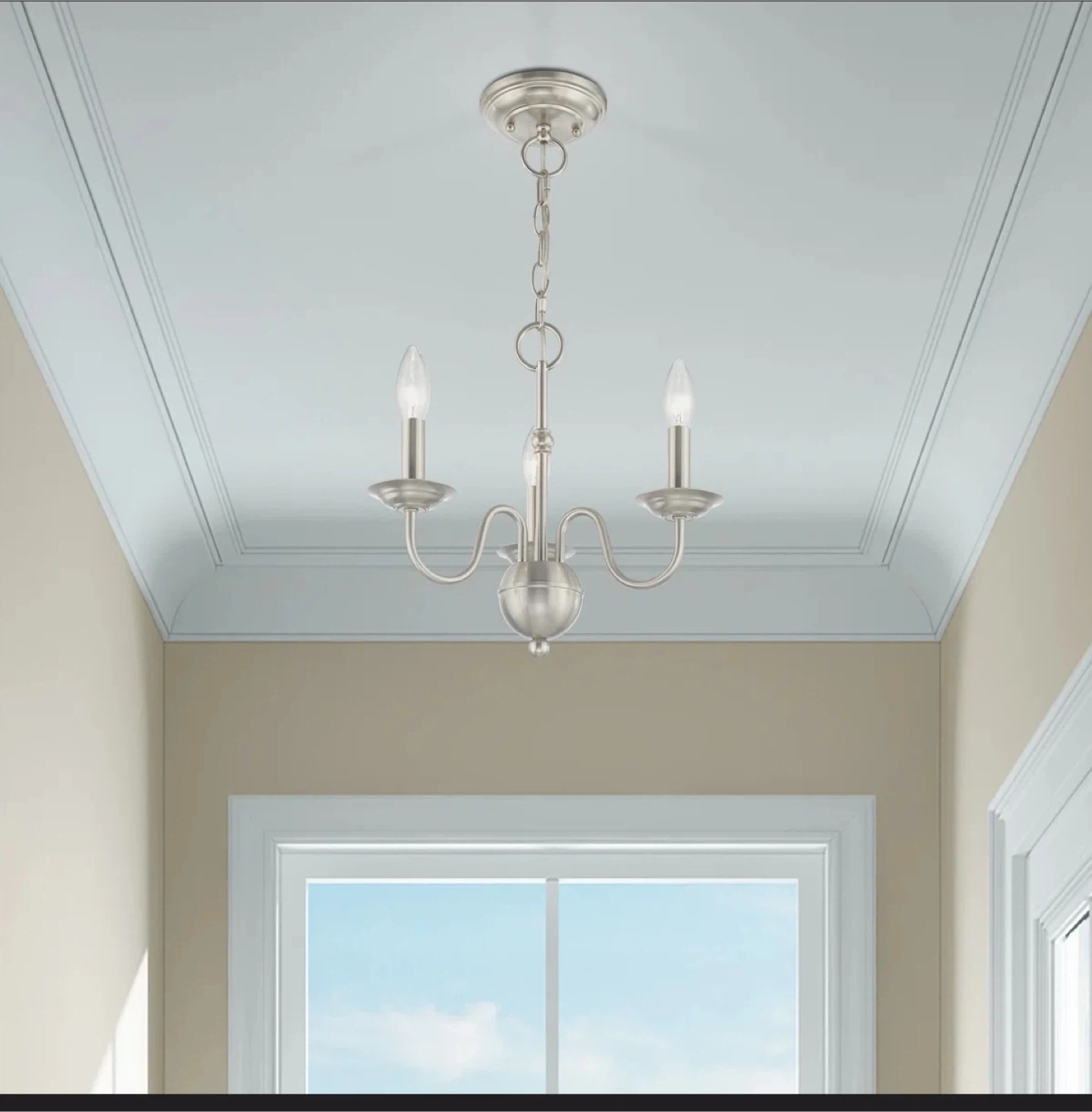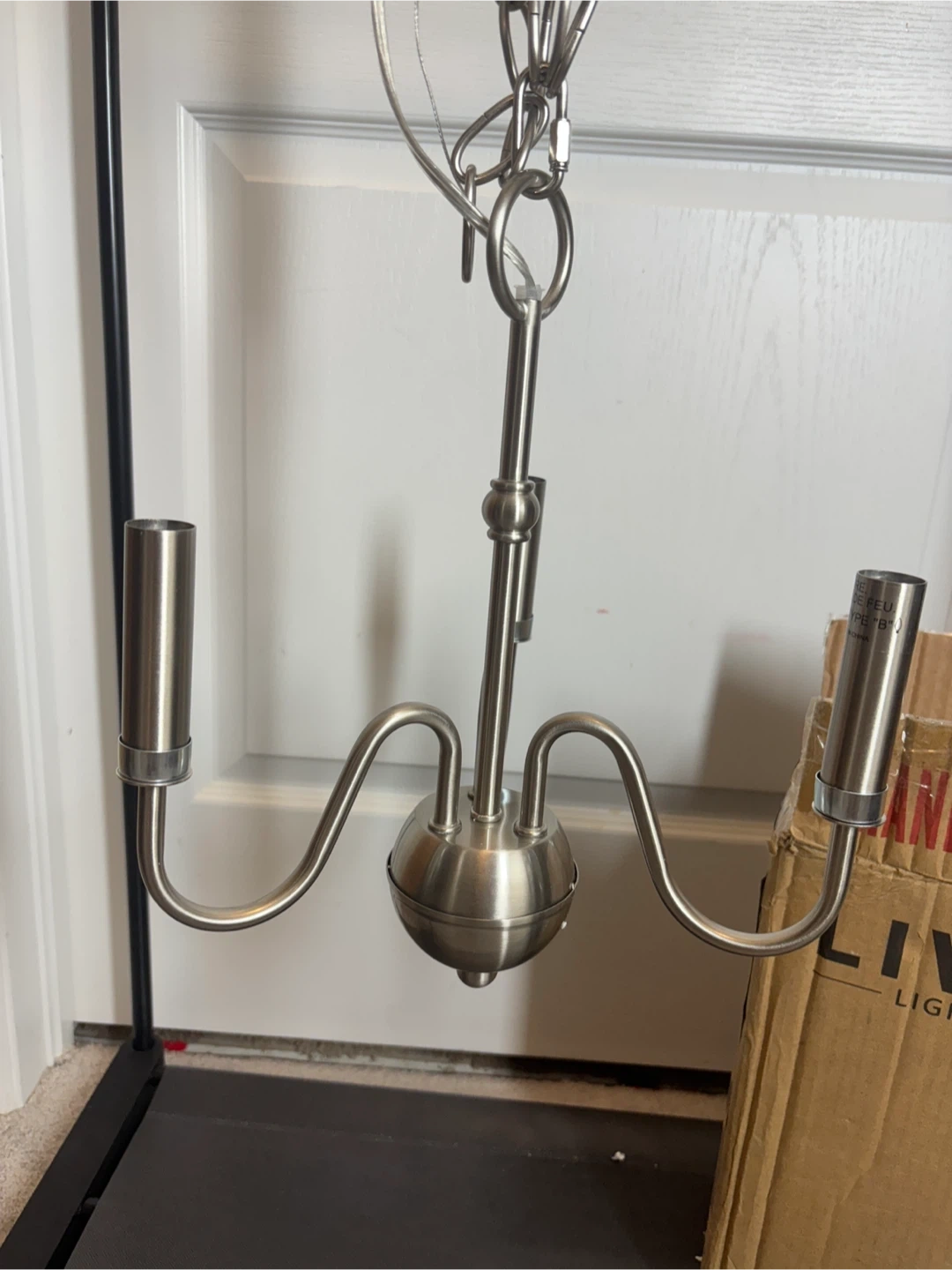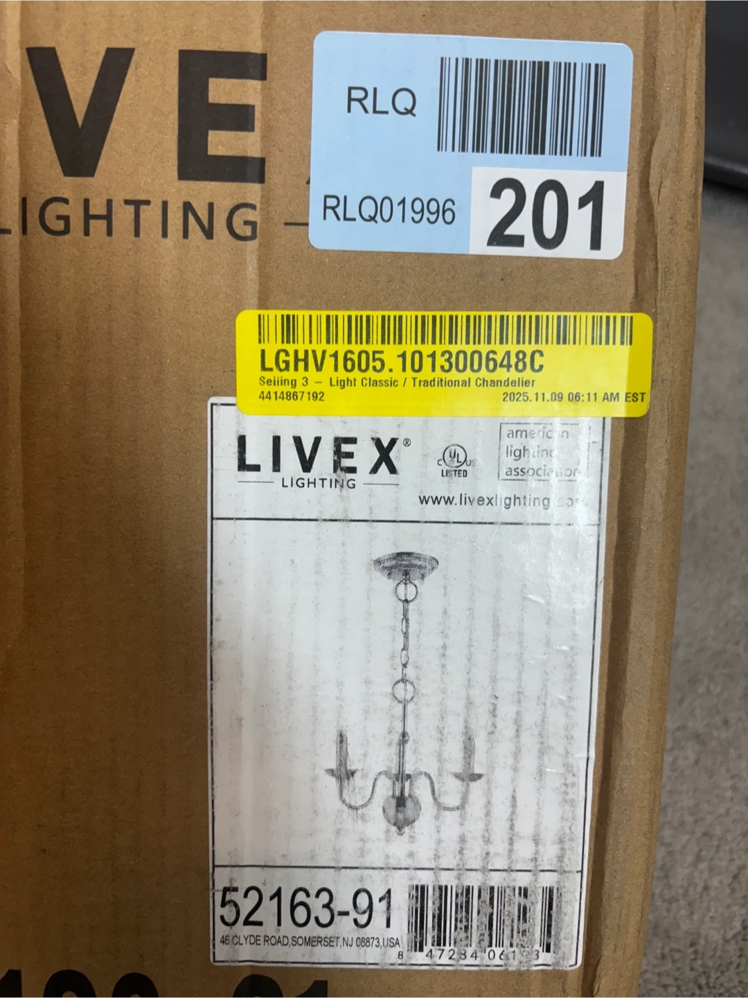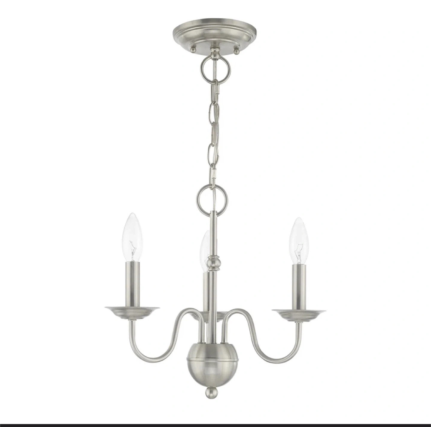 Selling a Three Posts ceiling chandelier. It's a classic, traditional style with three lights. The dimensions are approximately 36" in height and 14" in diameter.