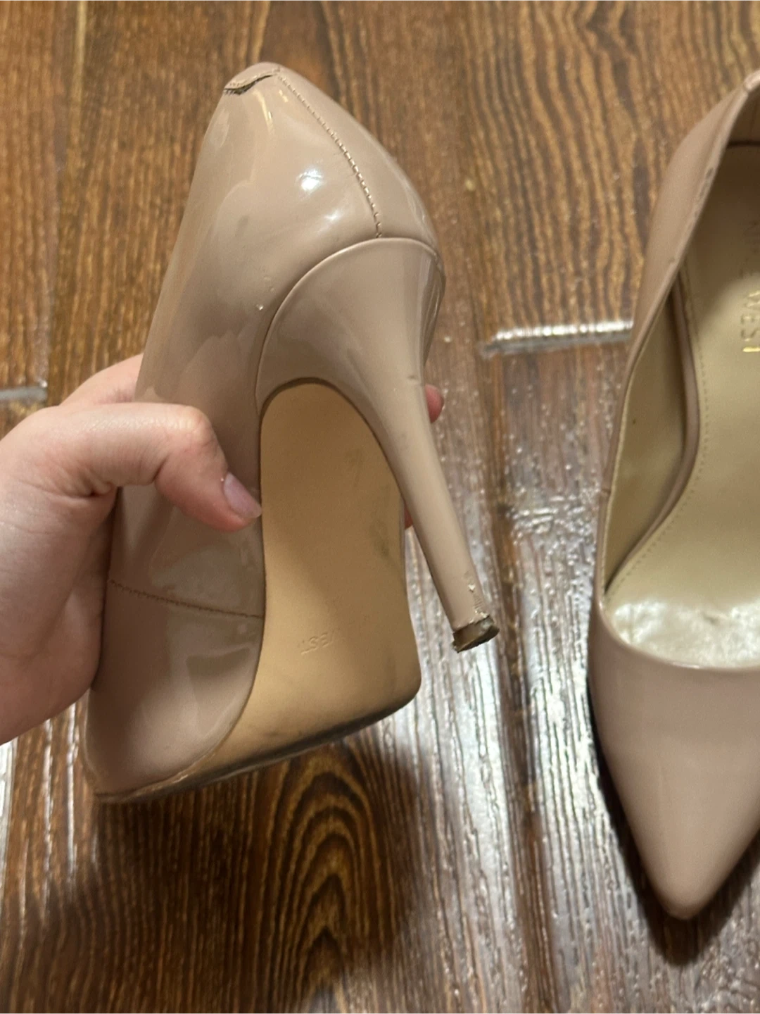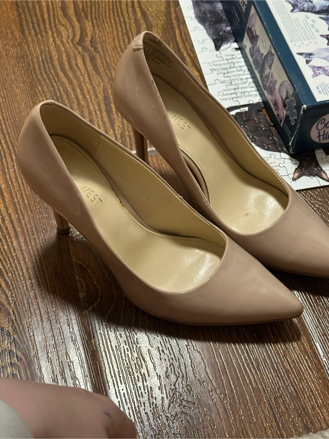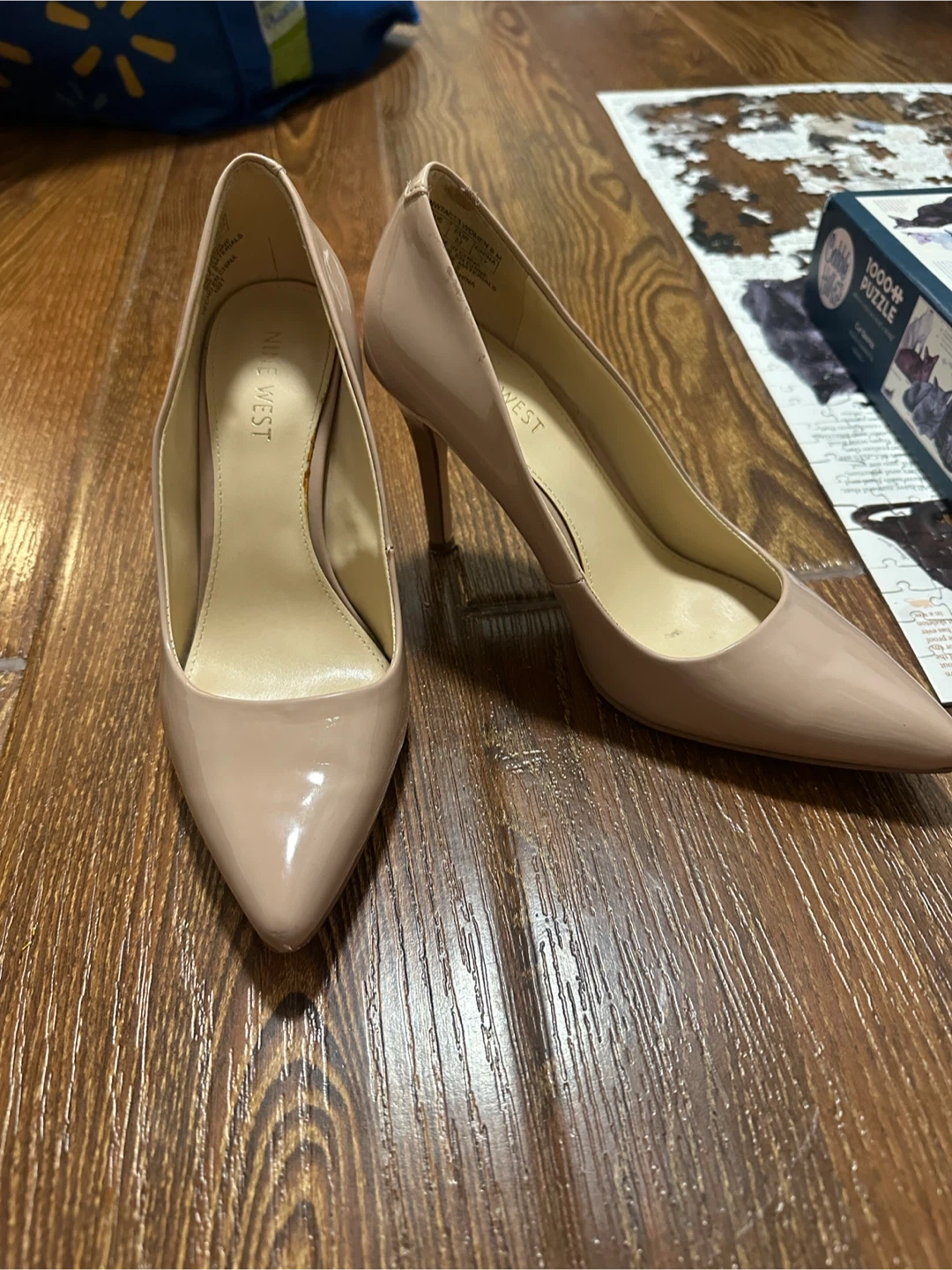 Classic Nine West heels in a nude patent leather finish. These pumps feature a pointed toe and a stiletto heel. There's some wear on the heel tips and soles, as shown in the photos. Great for dressing up any outfit!