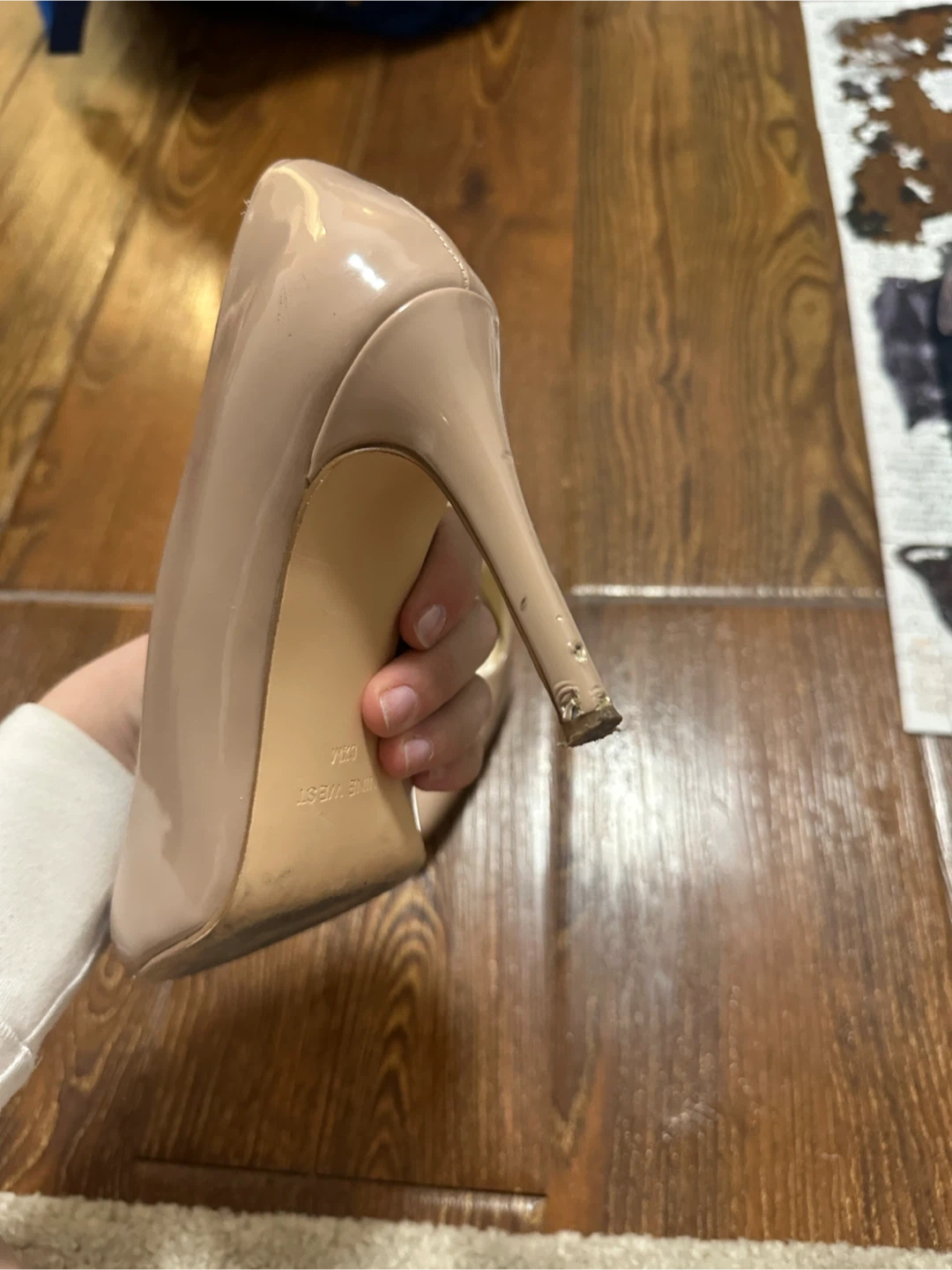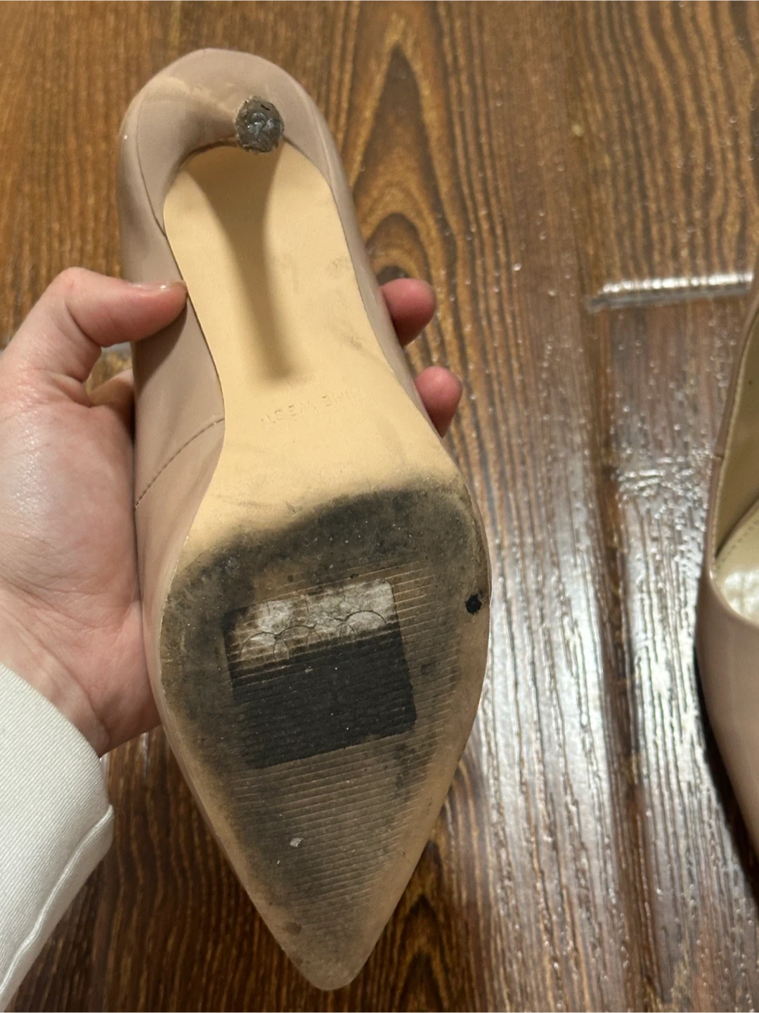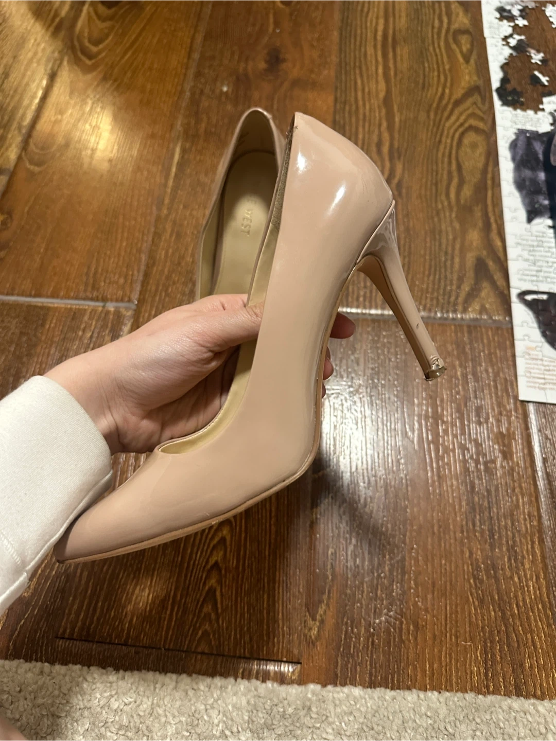 Classic Nine West heels in a nude patent leather finish. These pumps feature a pointed toe and a stiletto heel. There's some wear on the heel tips and soles, as shown in the photos. Great for dressing up any outfit!
