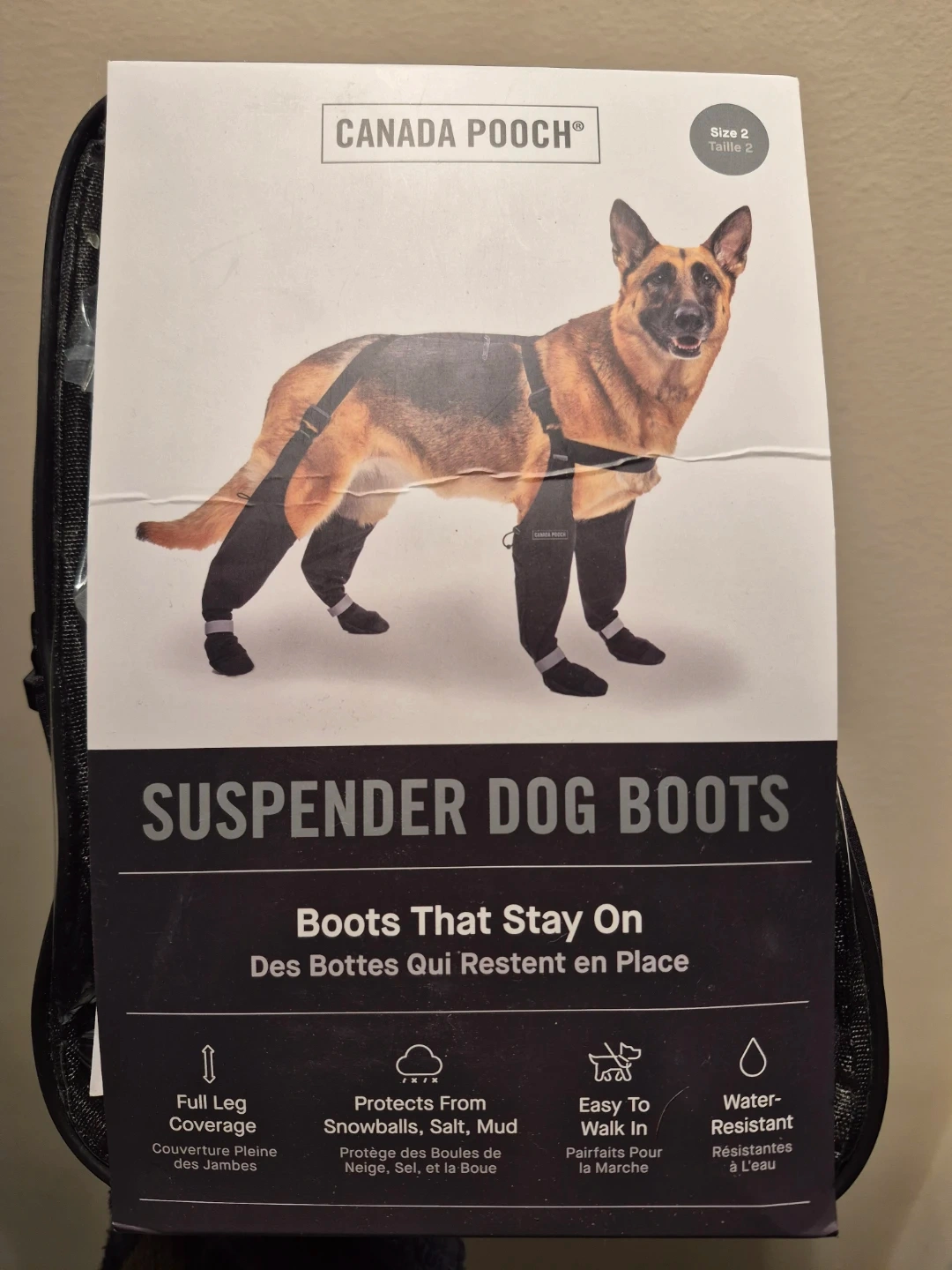 Canada Pooch Suspender Dog Boots in size 2. These boots offer full leg coverage and protect from snowballs, salt, and mud. They're water-resistant and designed for easy walking.