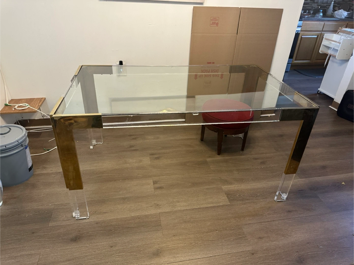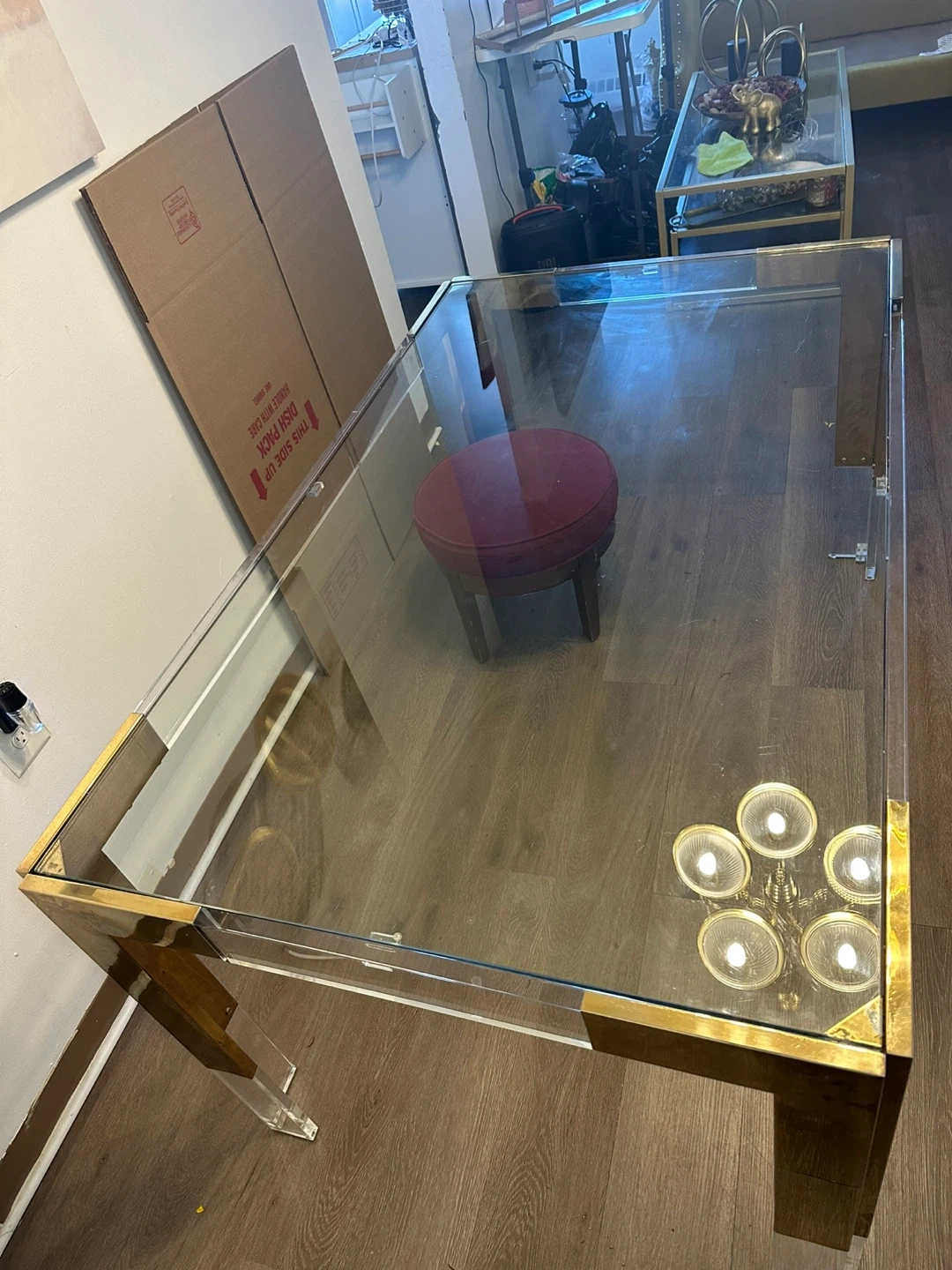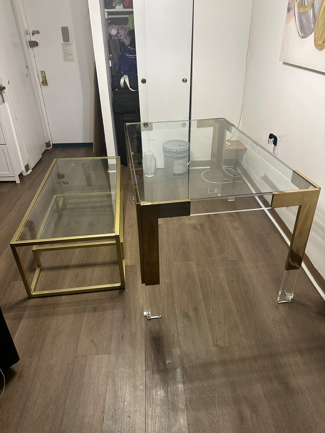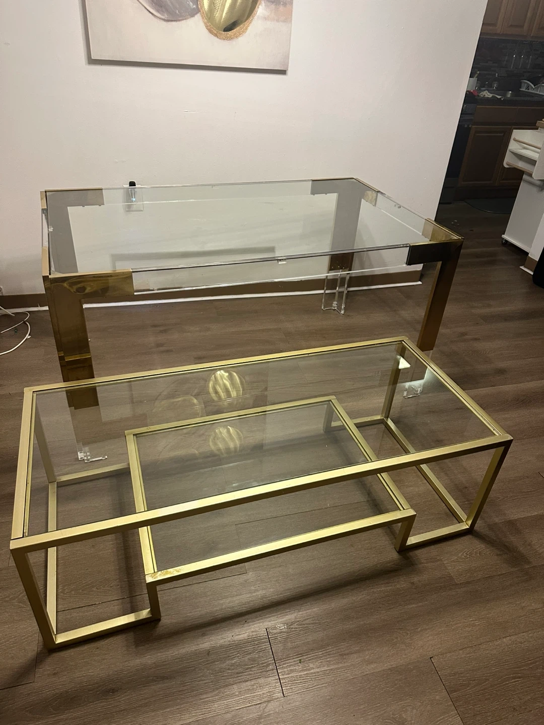 Set of two nested tables. Features clear glass tops with gold-tone metal frames and acrylic legs. A stylish addition to any living space!