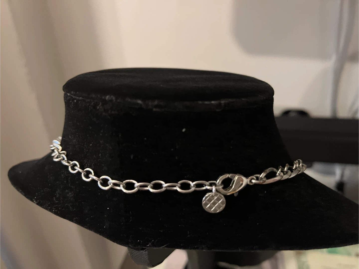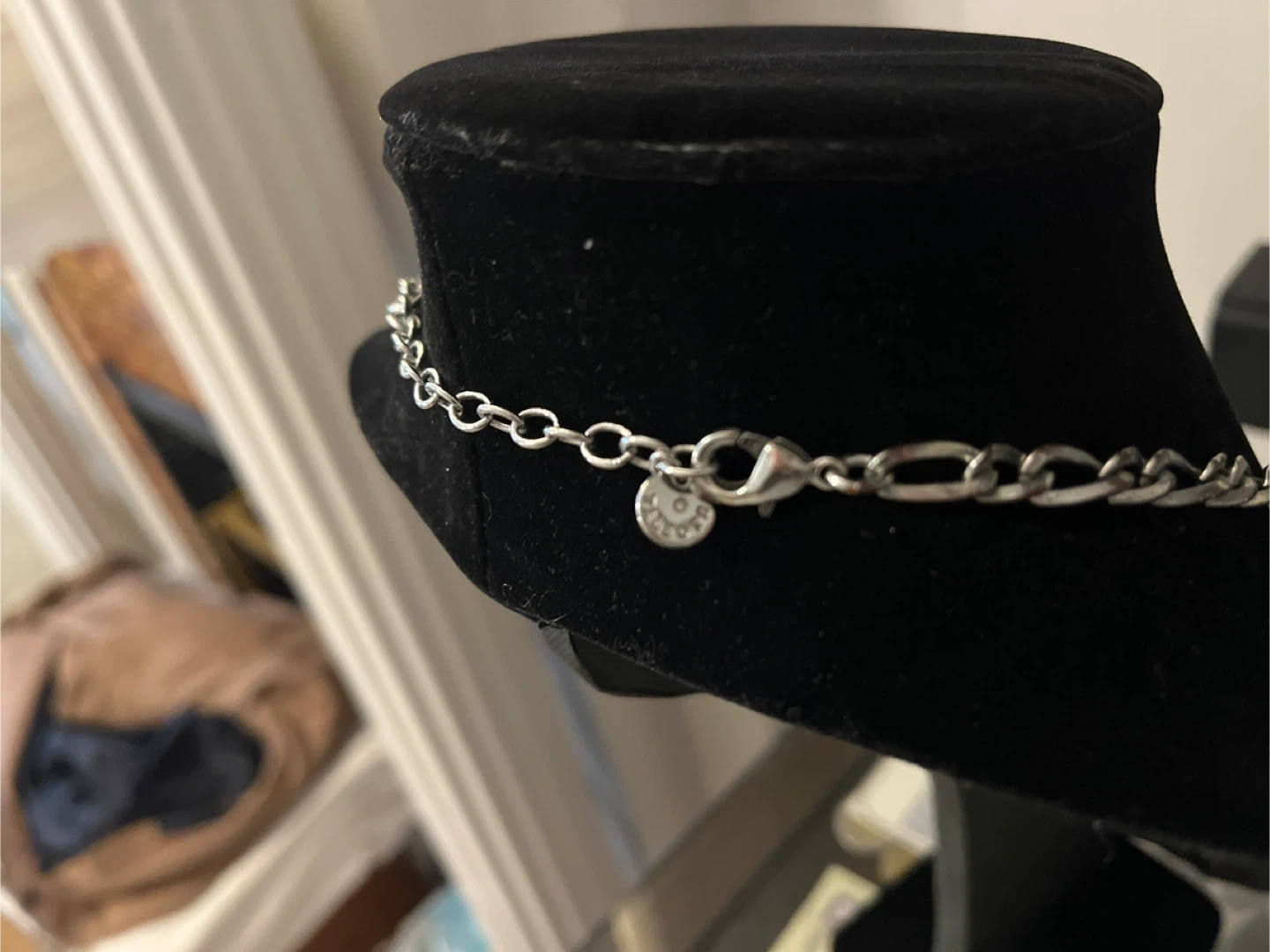 This statement necklace features a chunky silver-tone chain with dark blue *fabric* flowers and faux gemstone accents. It's a bold piece designed to draw attention!