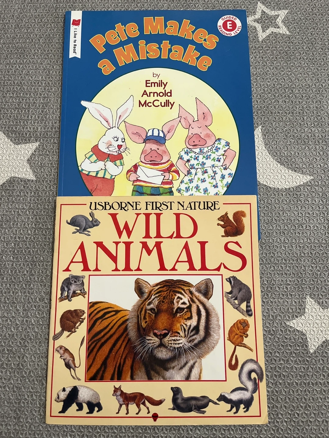This listing includes two children's books: 'Pete Makes a Mistake' by Emily Arnold McCully and 'Usborne First Nature: Wild Animals'. Both are intended for young readers. 'Pete Makes a Mistake' is part of the 'I Like to Read' series and has a Guided Reading Level E.