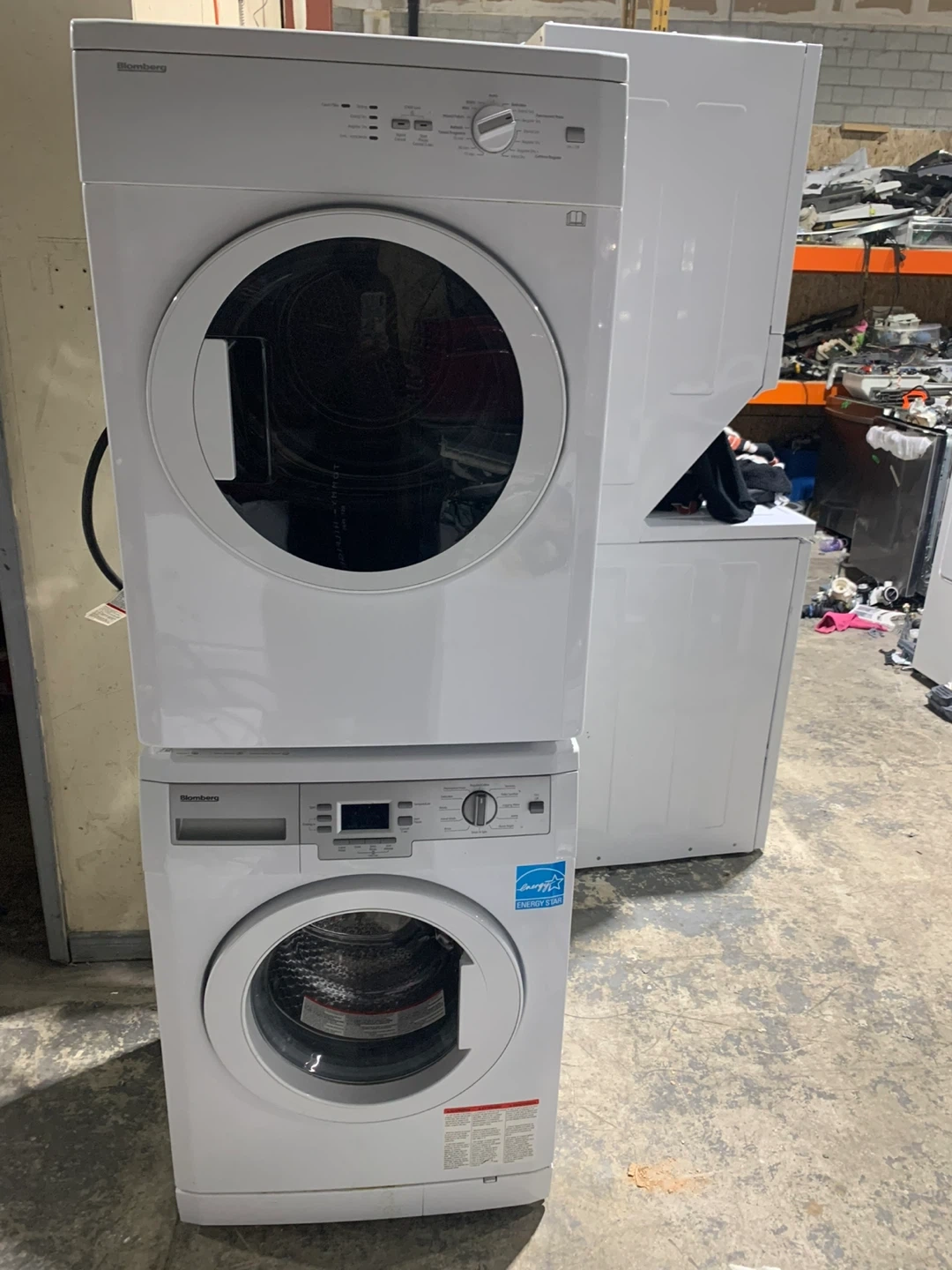 This is a Blomberg stackable washer and dryer set. It's white and comes with a washer on the bottom and a dryer on top. Both units are in good condition.