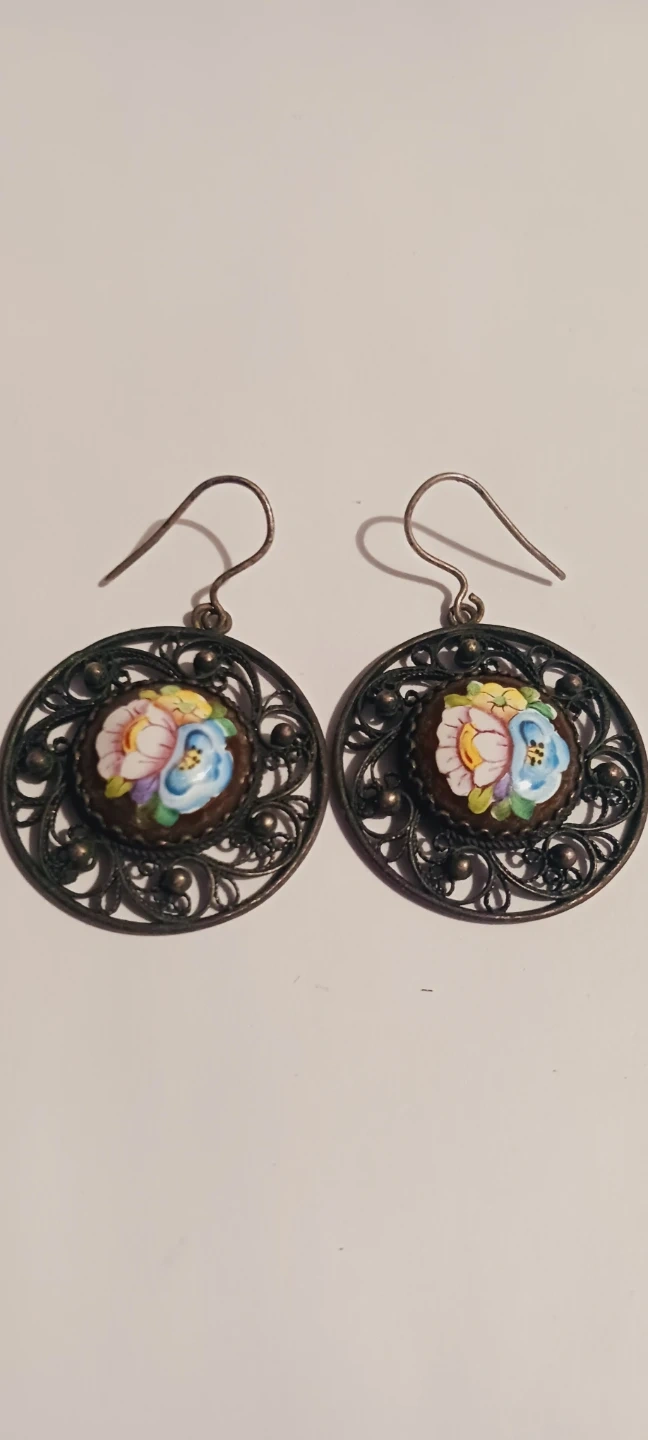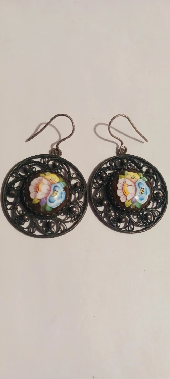 These charming drop earrings feature intricate filigree metalwork with colorful floral enamel details. They're lightweight and designed for pierced ears. Perfect for adding a touch of vintage elegance to any outfit! 2"×1.5". Excellent condition. ALL MY PRICES ARE NEGOTIABLE !!