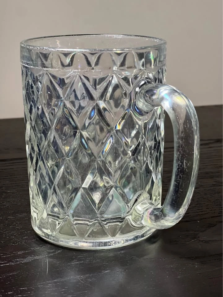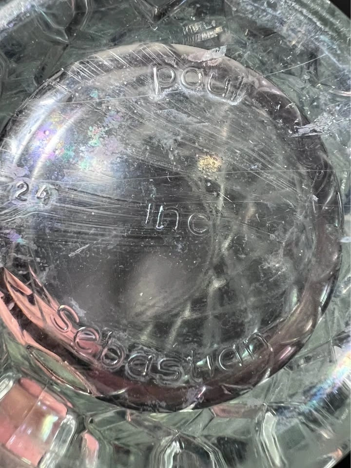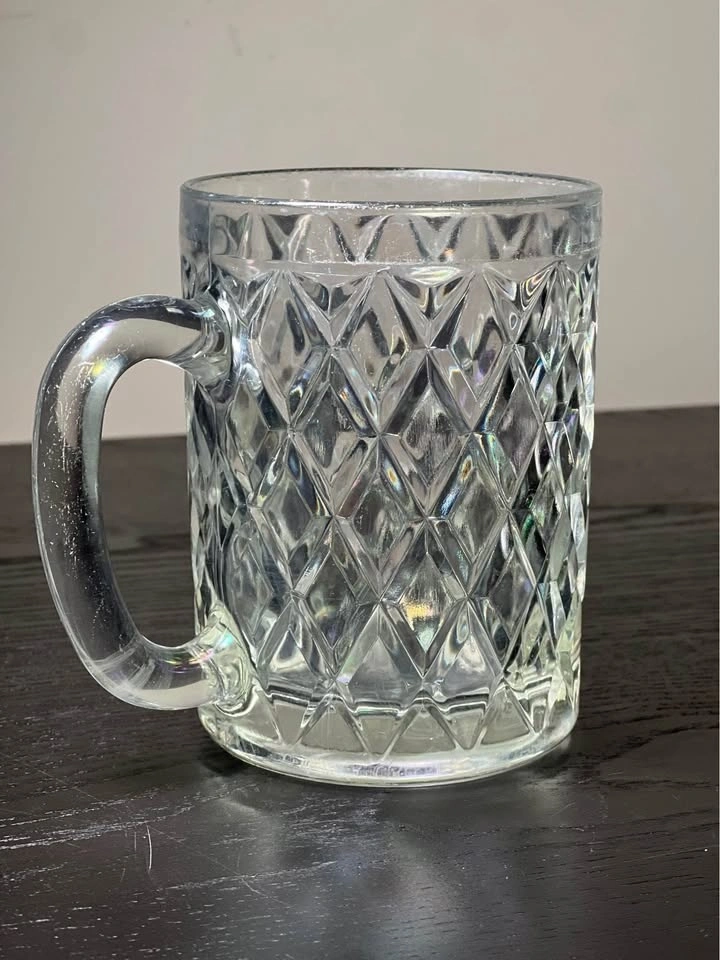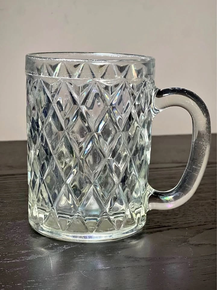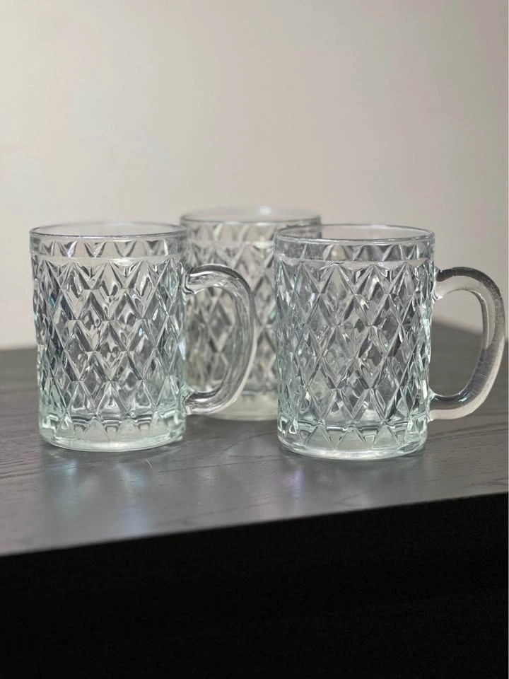 Set of 3 vintage Paul Sebastian crystal glass mugs by Arcoroc. These feature a distinctive diamond-cut or crisscross pattern and a sturdy C-shaped handle. They were often included as a gift with Paul Sebastian fragrance sets in the 1980s and 90s. Each mug is approximately 4.25” tall. Pre-owned. Pickup is at 58th and 7th Ave in Midtown Manhattan.