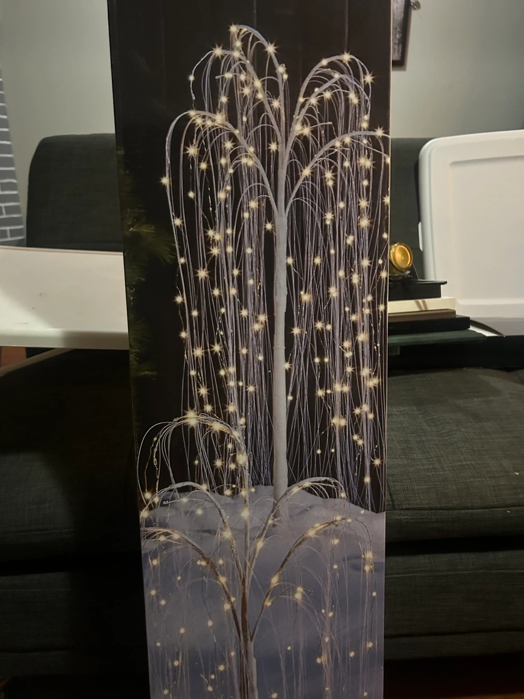 Selling a used set of two Canvas Whispering Willow Trees! These trees are 3 1/2' and 5' tall. They are powered by NOMA and feature 160 & 216 warm white LEDs with a combination of steady and twinkle lights. Perfect for adding a touch of elegance to any space!