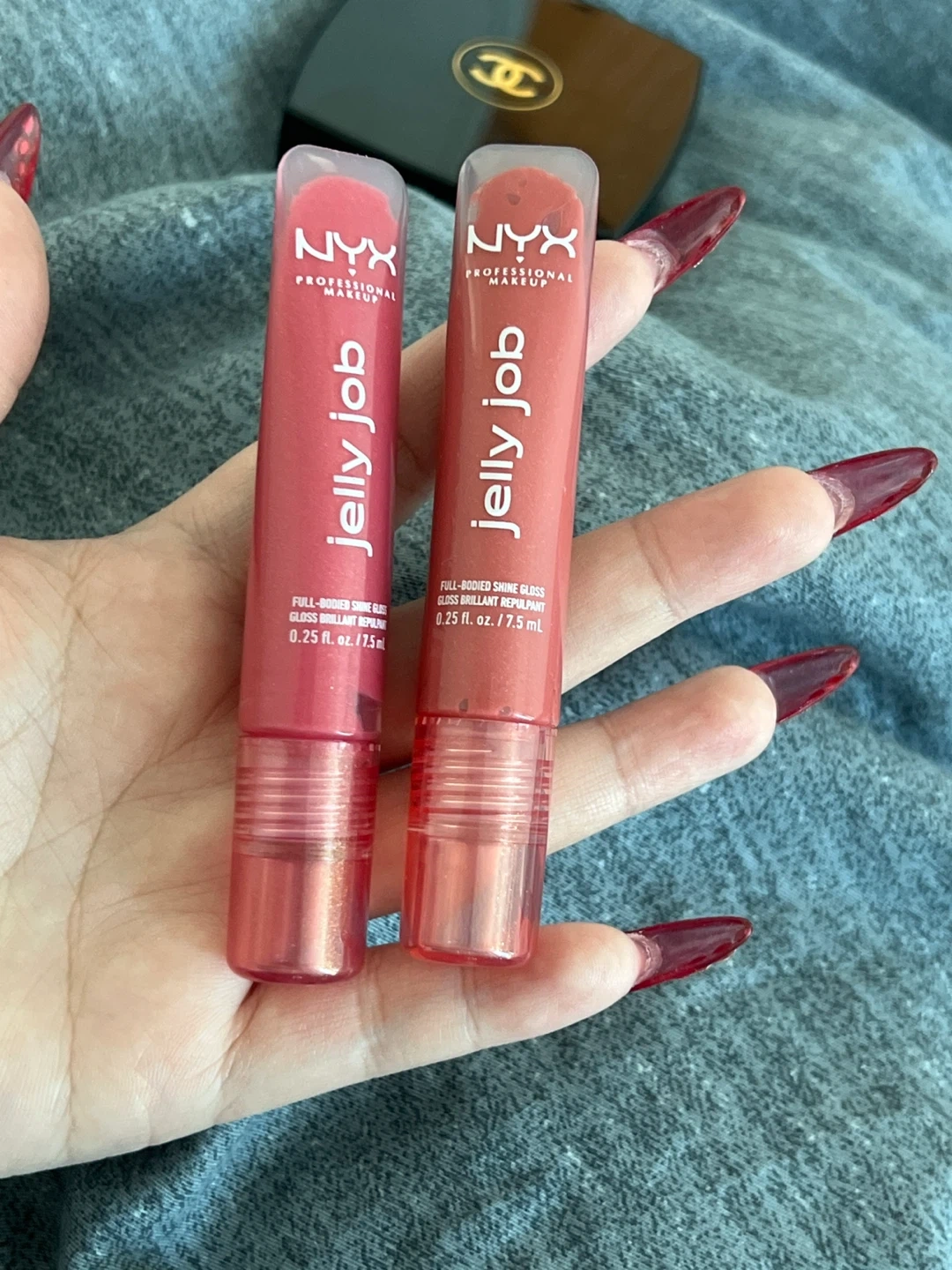 Two NYX Jelly Job full-bodied shine glosses are included. Each gloss contains 0.25 fl. oz. or 7.5 ml. The colours appear to be pink and coral tones.