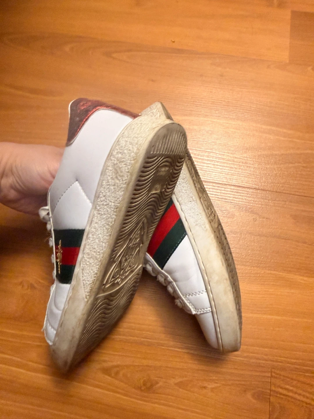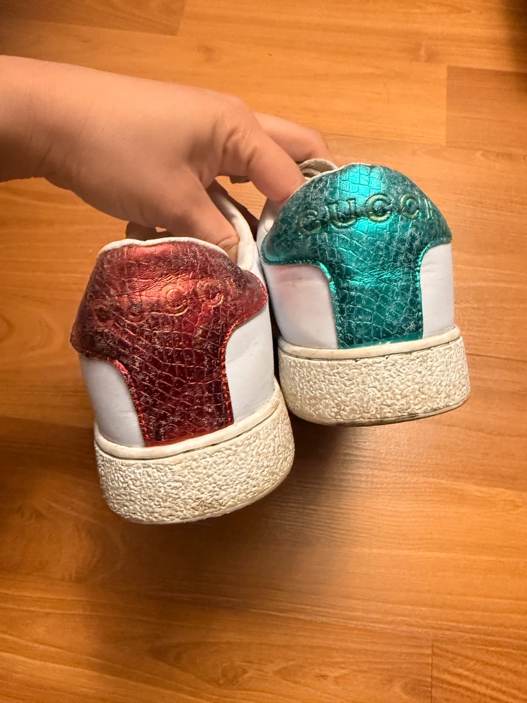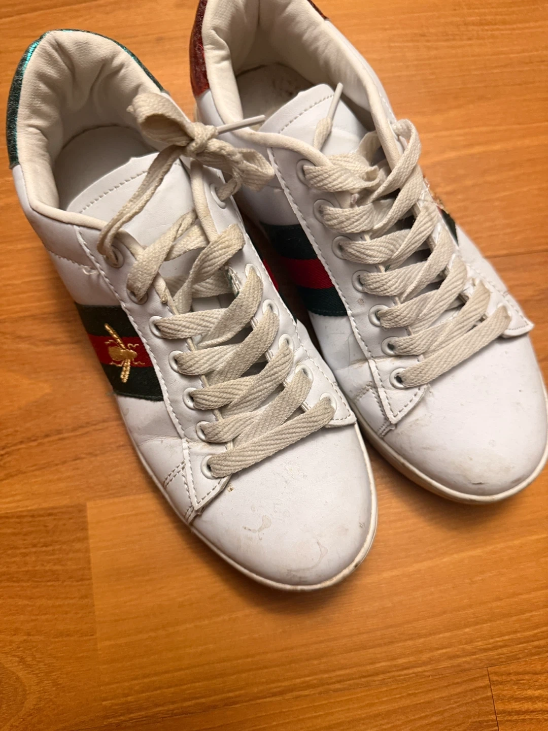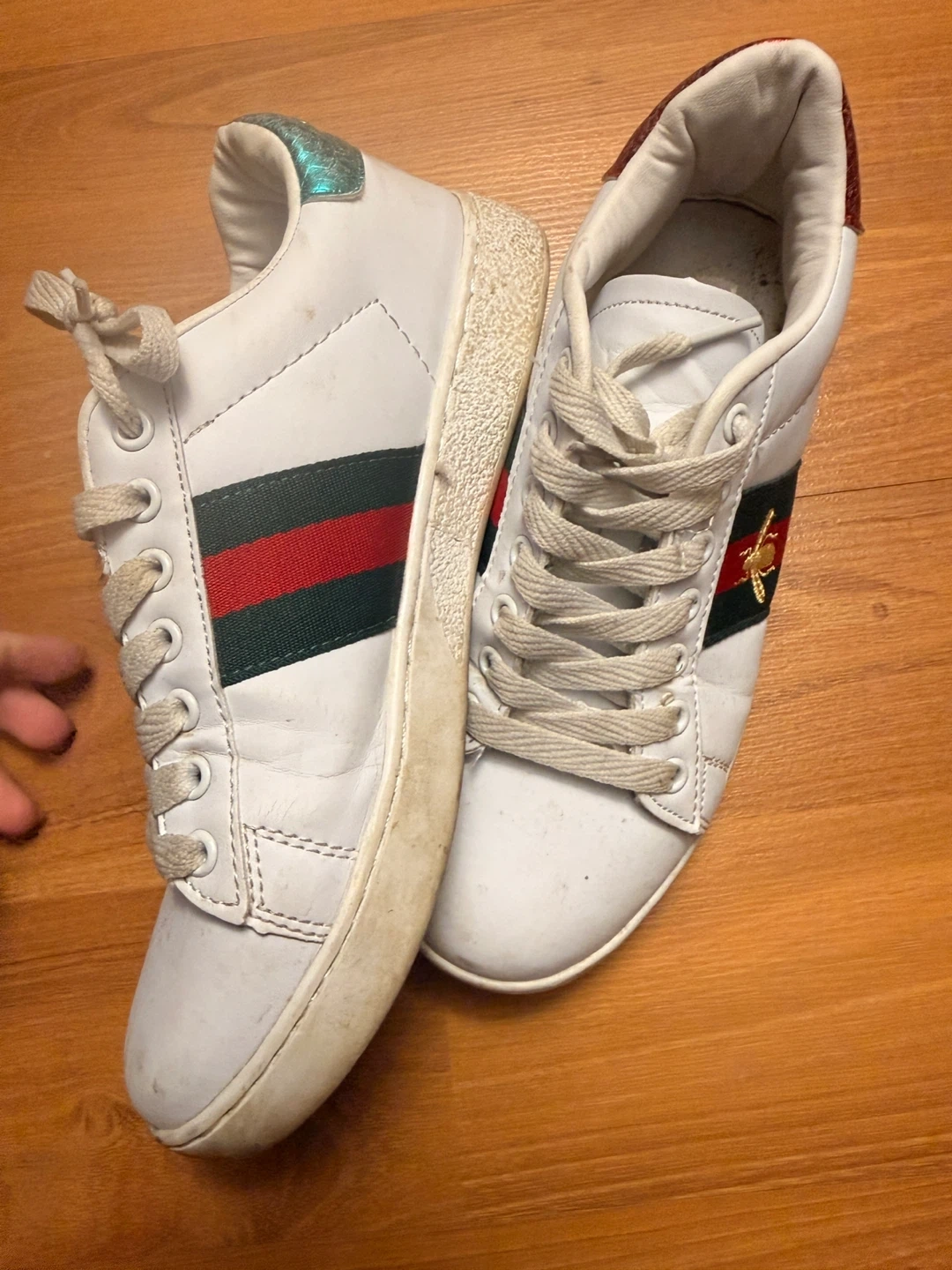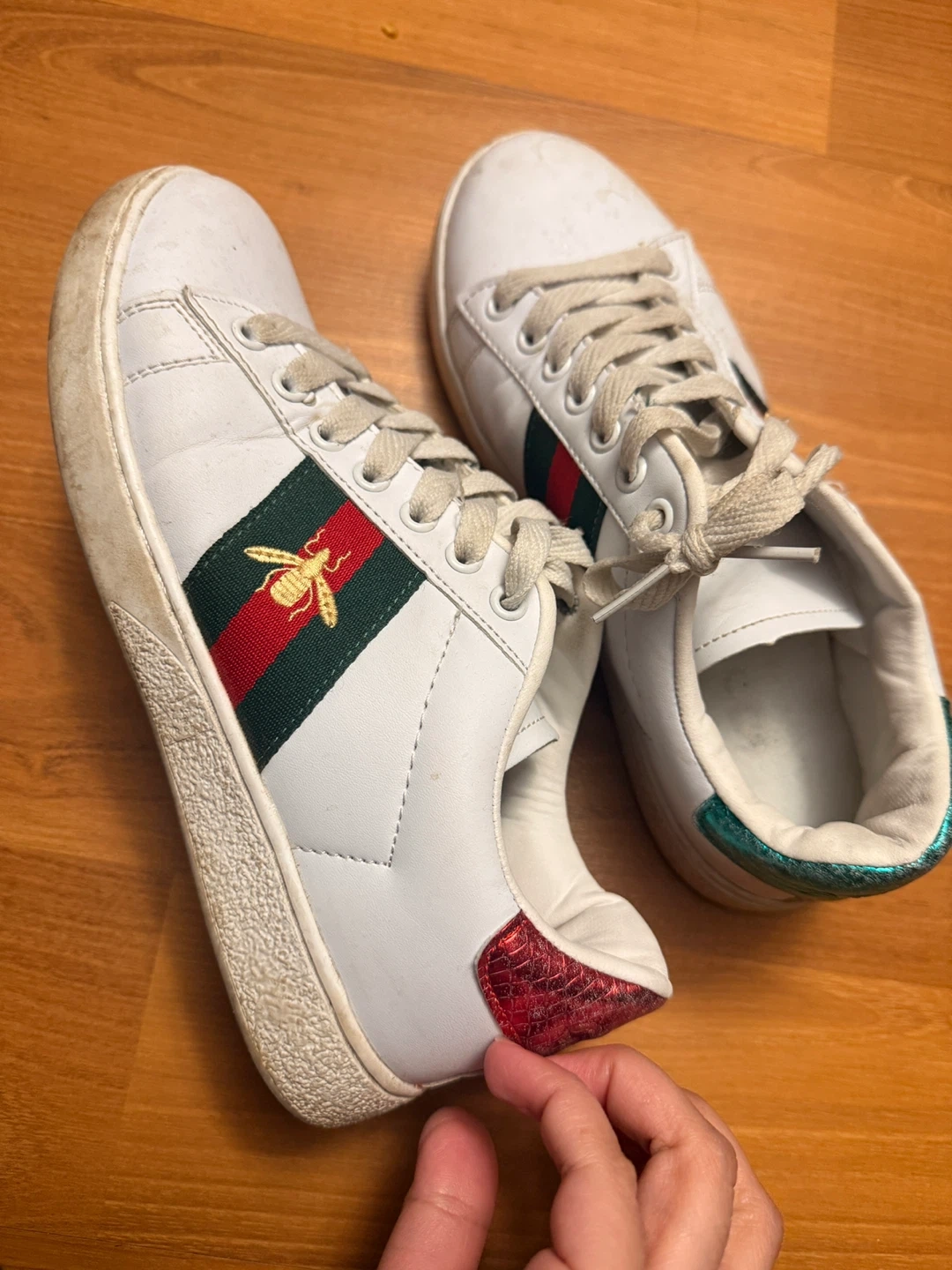 White leather Gucci Ace sneakers with the iconic red and green stripe and bee embroidery. They feature contrasting red and teal cracked metallic heel tabs. These shoes are a size 37.