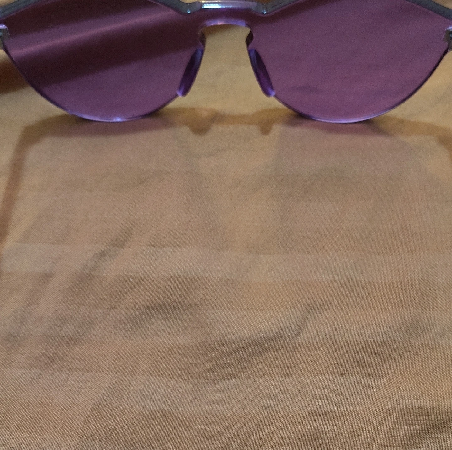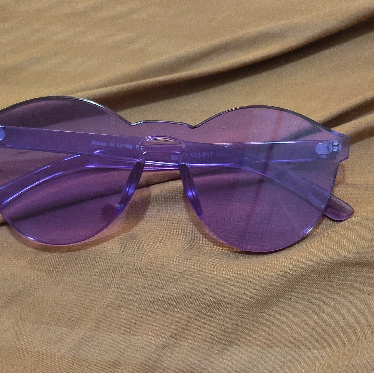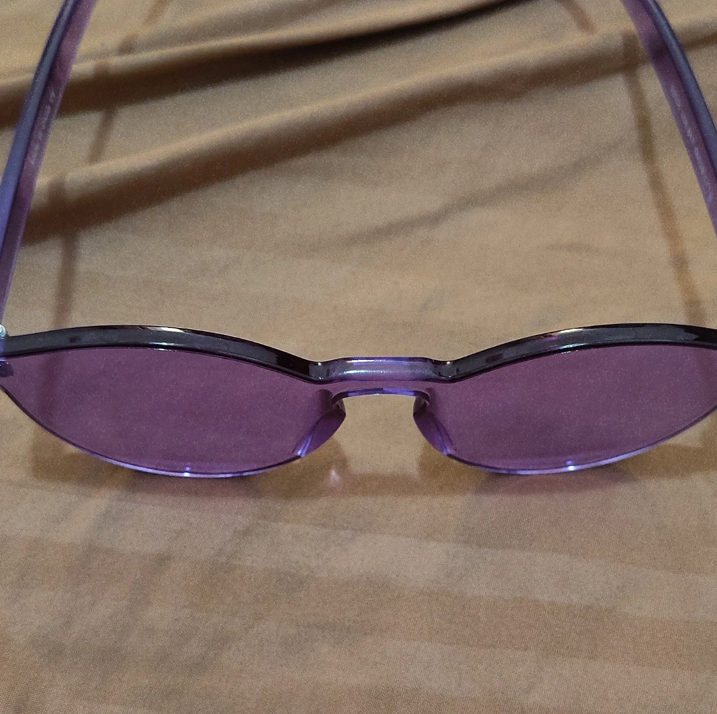 Funky purple tinted sunglasses. These offer a unique, frameless look with a plastic frame and arms. Perfect for adding a pop of color to any outfit!