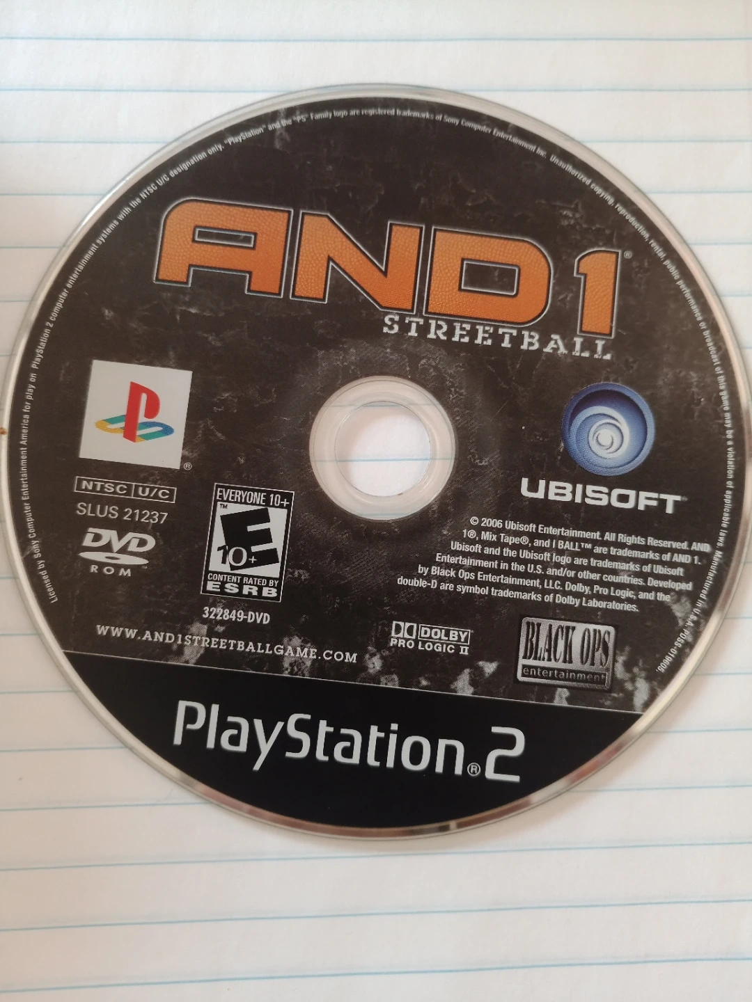 This is the AND 1 Streetball game for PlayStation 2. It's a sports game that lets you play street basketball. The disc is for the PlayStation 2 console. This game is rated E for Everyone 10+.
