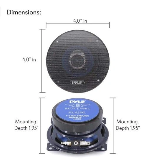 10One pair 4" two-way speakers. Standard 4" size fits OEM locations. Non-fatiguing butyl rubber surround. Blue poly injection cone. 3/4" high temperature ASV voice coil. 20 oz. magnet structure. 1/2" neodymium film dome tweeter. Brand: Pyle
