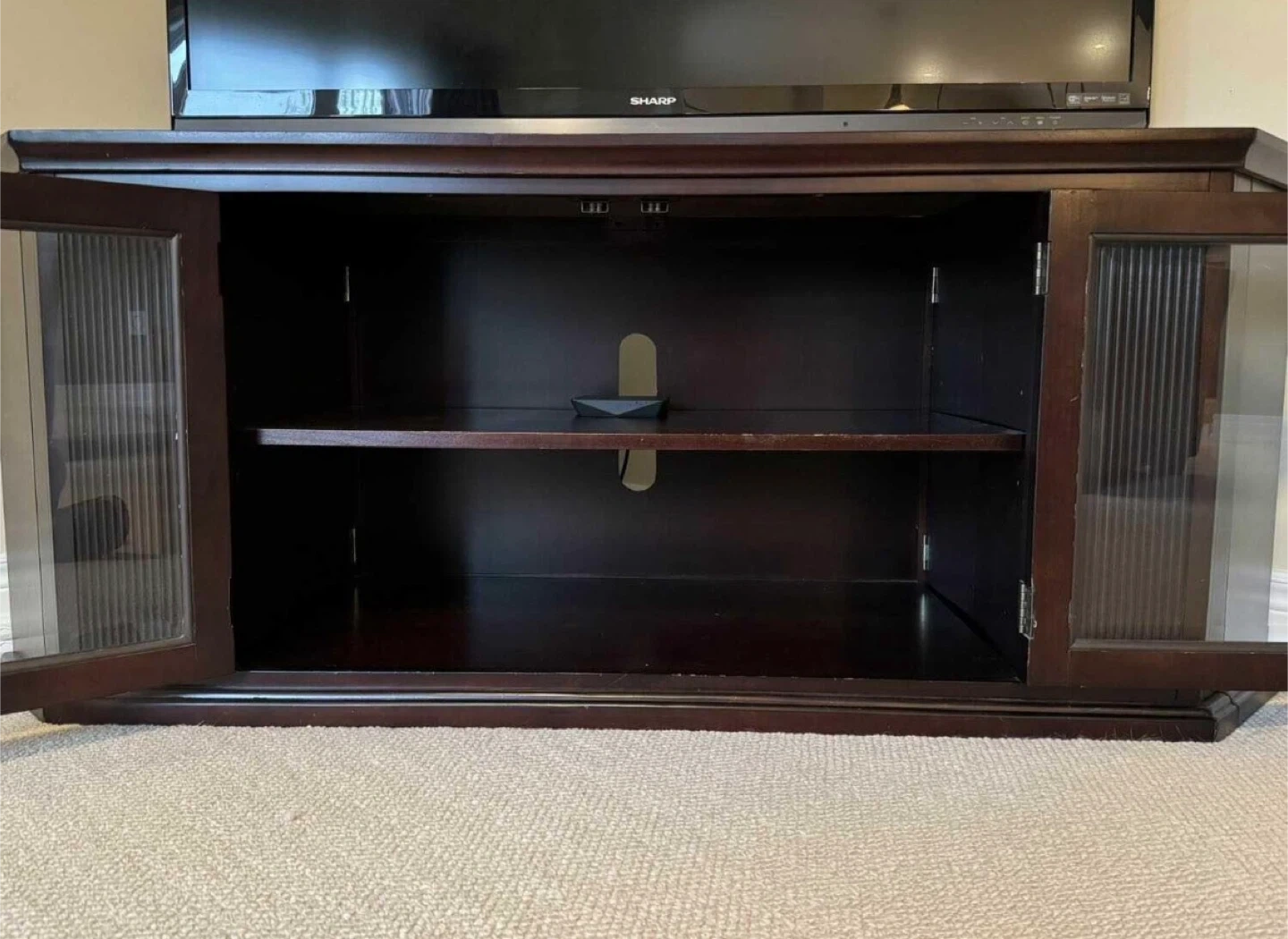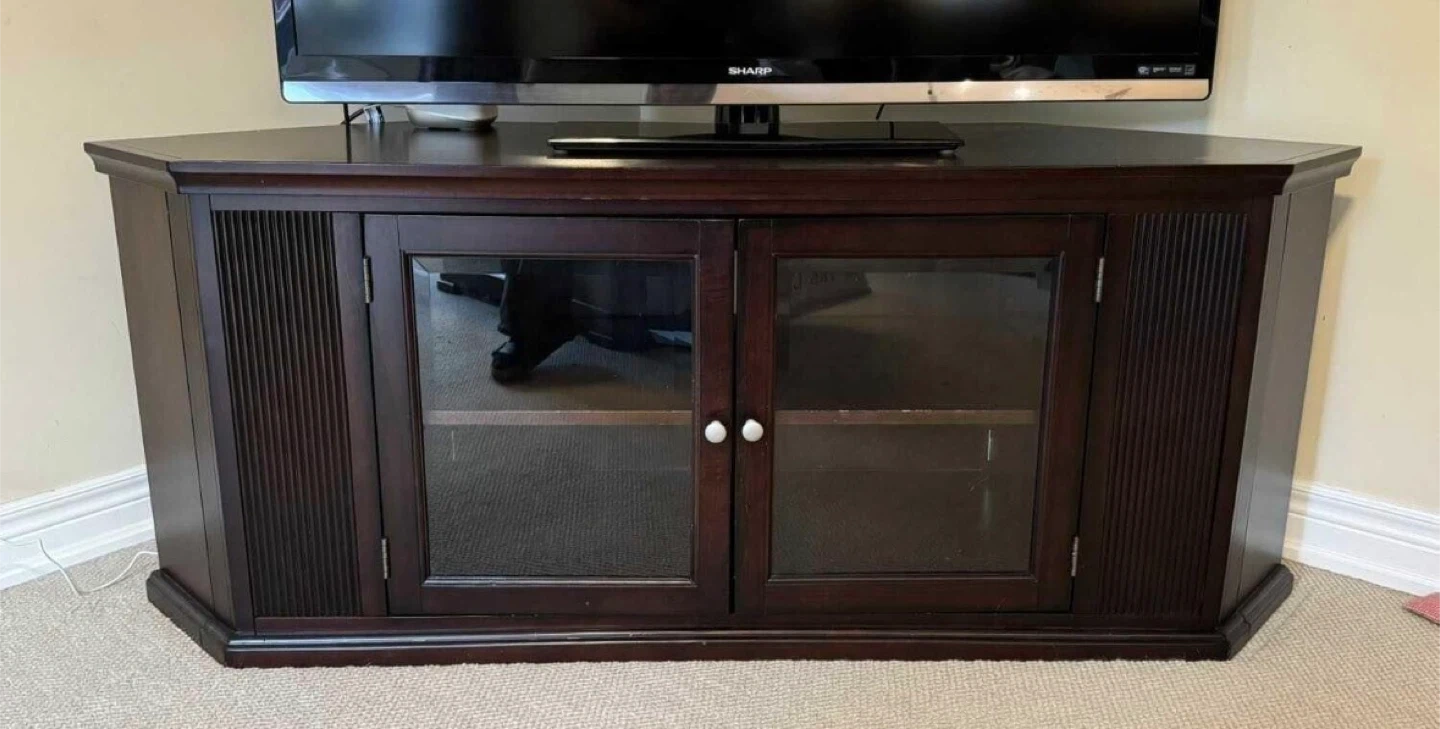This dark wood TV stand is designed for corner placement. It features two glass-fronted cabinet doors with white knobs. The interior has adjustable shelving for media components. It's a great way to organize your entertainment setup!