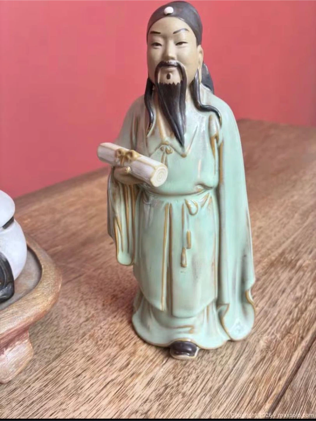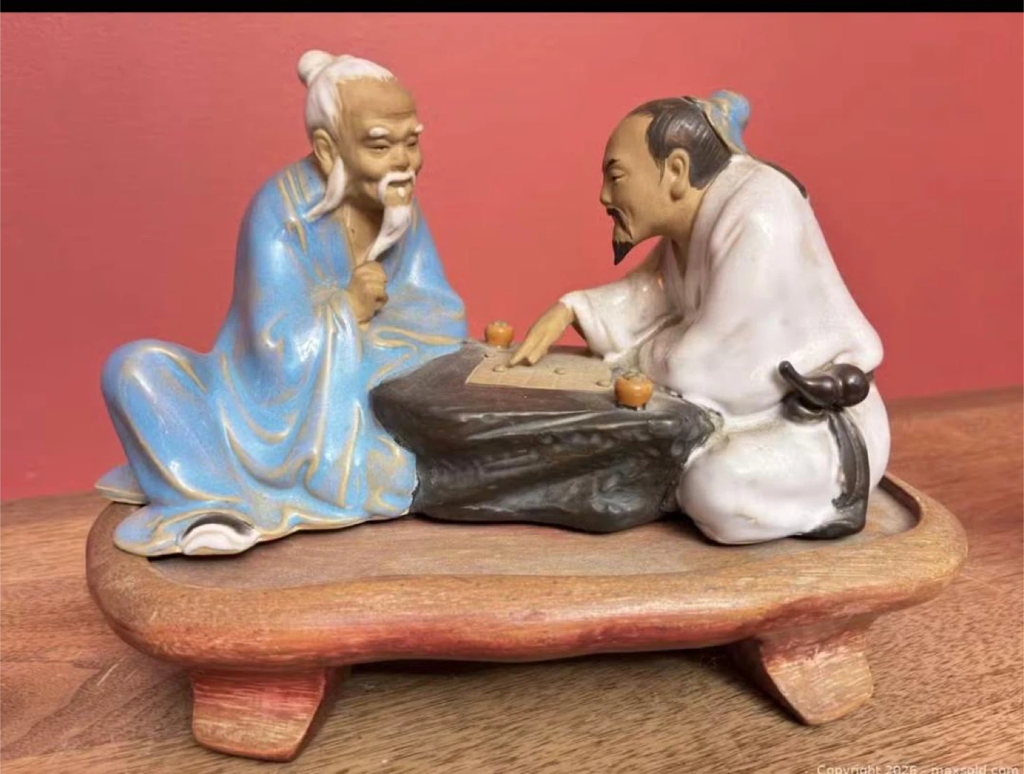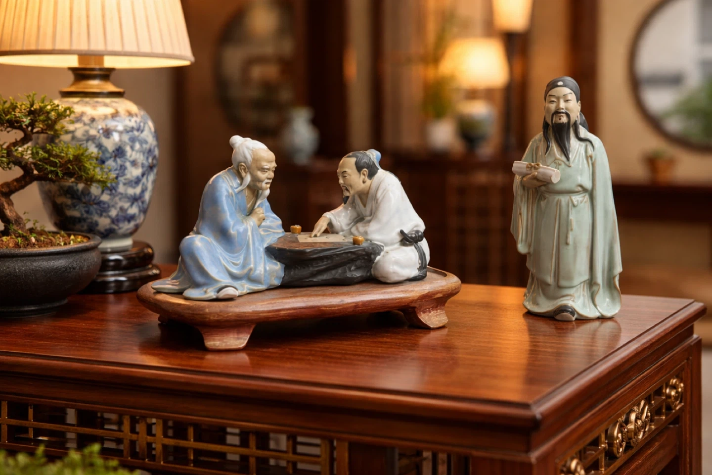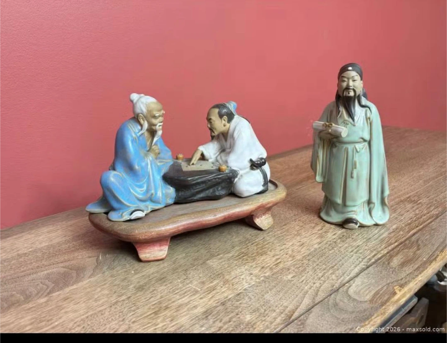 This set features three ceramic figurines depicting scholars. Two are playing a board game on a wooden base, while the third stands separately holding a scroll. They're decorative pieces with a traditional Chinese aesthetic.