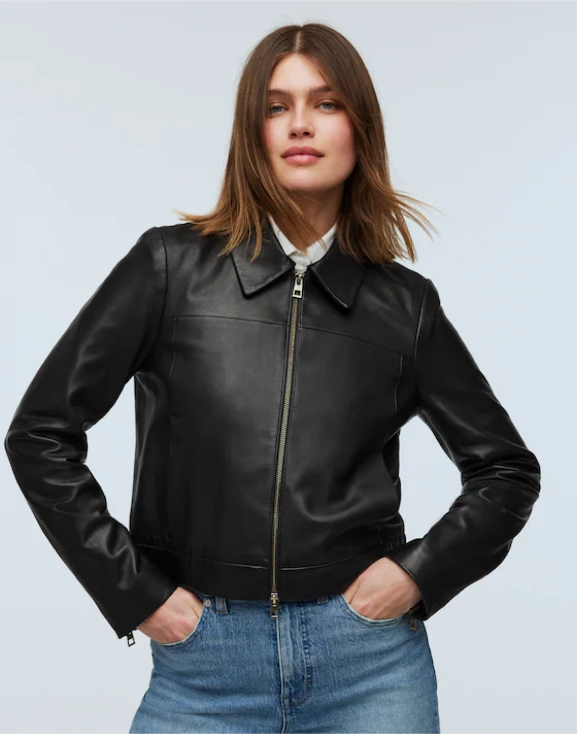 This is a black cropped leather jacket from Madewell. It features a zip-up front and a classic collar. Made from leather.