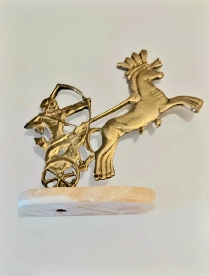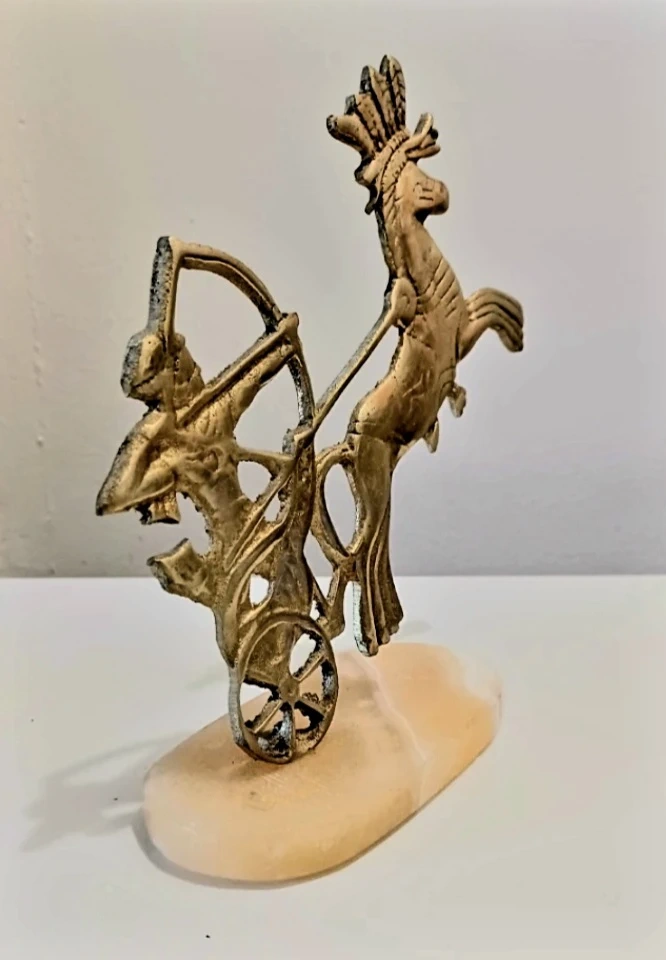Brass Handmade Pharaoh Archer Chariot Horse Marble Base Statue