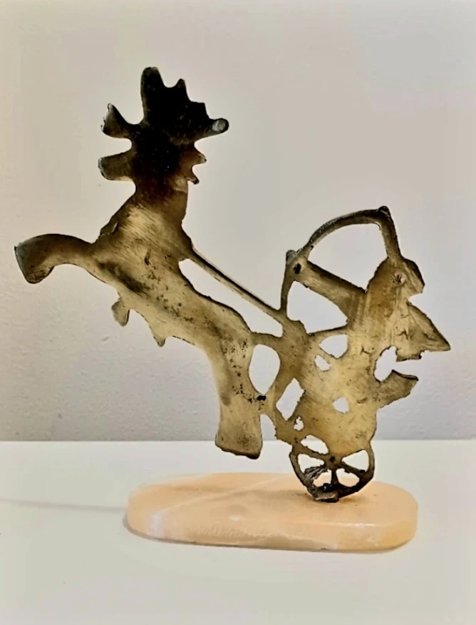 Unique, Hand-crafted Brass Egyptian Pharaoh Chariot Statue features a figure with a bow and arrow riding a Horse-drawn Chariot, mounted on a Marble Base. It's a unique piece in very good condition, perfect for collectors or as a decorative item.