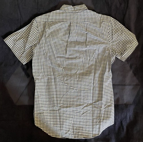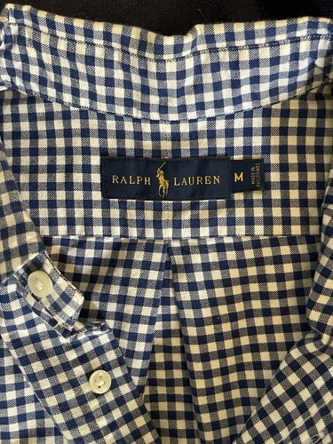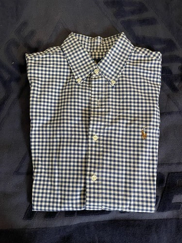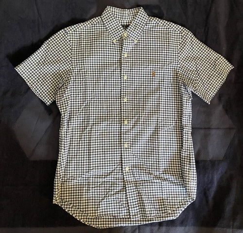 This is a Ralph Lauren men's short sleeve button-down shirt in size M. The shirt features a classic blue checkered design and a button-down collar. Perfect for a casual yet stylish look.