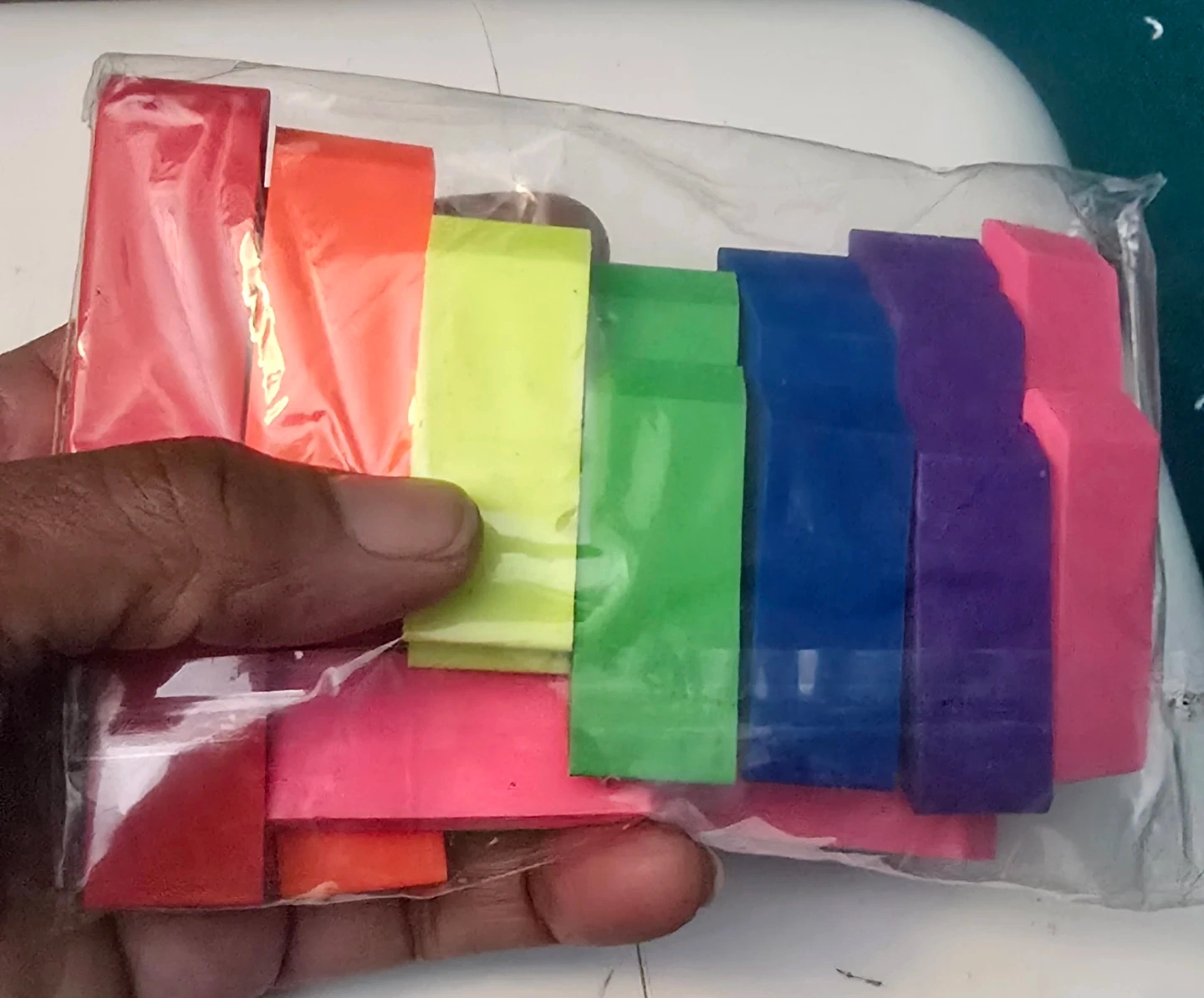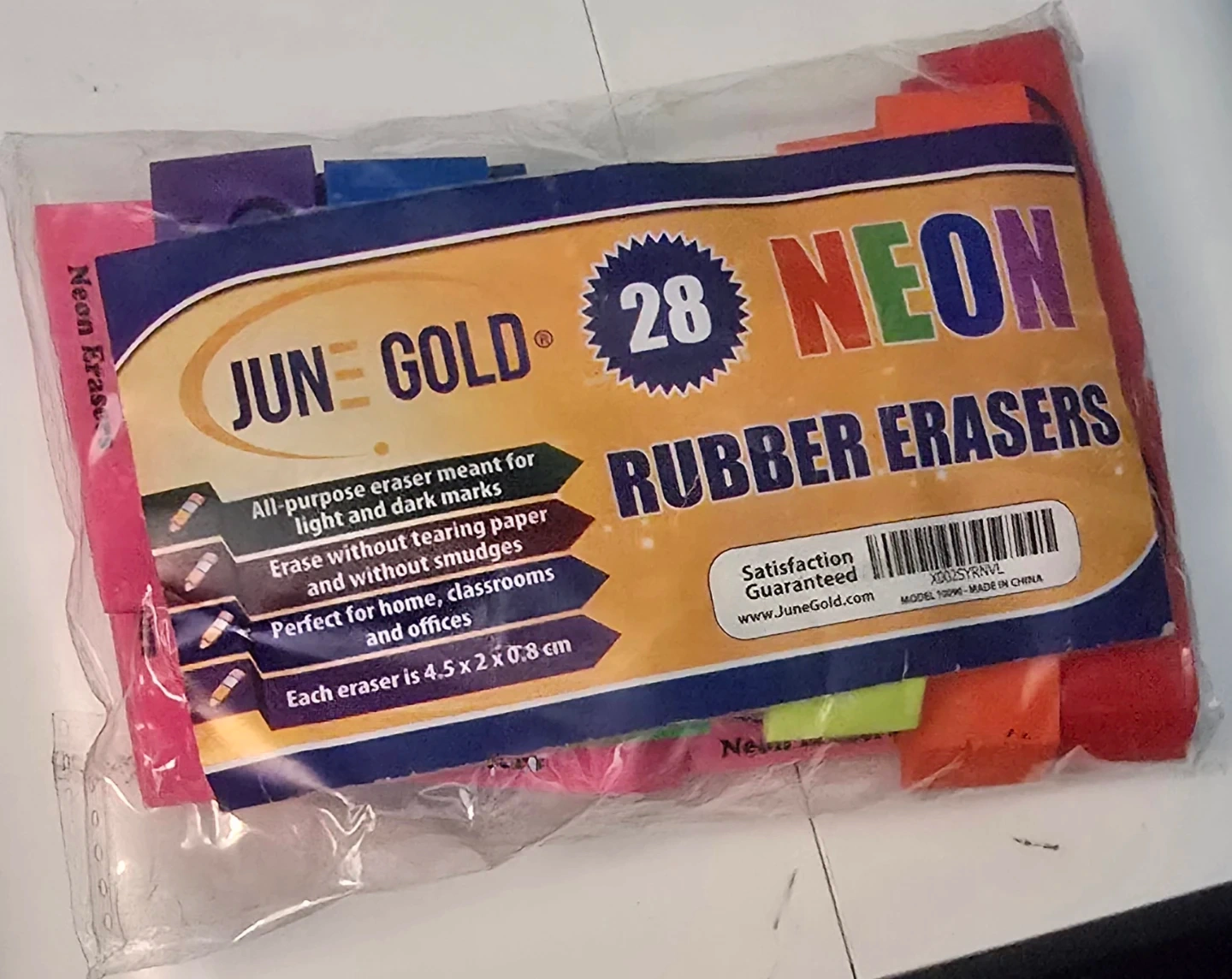 I'm selling a brand new pack of June Gold Neon Rubber Erasers! This pack includes 28 erasers in various neon colors. Each eraser is 4.5 x 2 x 0.8 cm, perfect for home, classrooms, and offices. They are all-purpose erasers meant for light and dark marks, and erase without tearing paper and without smudges